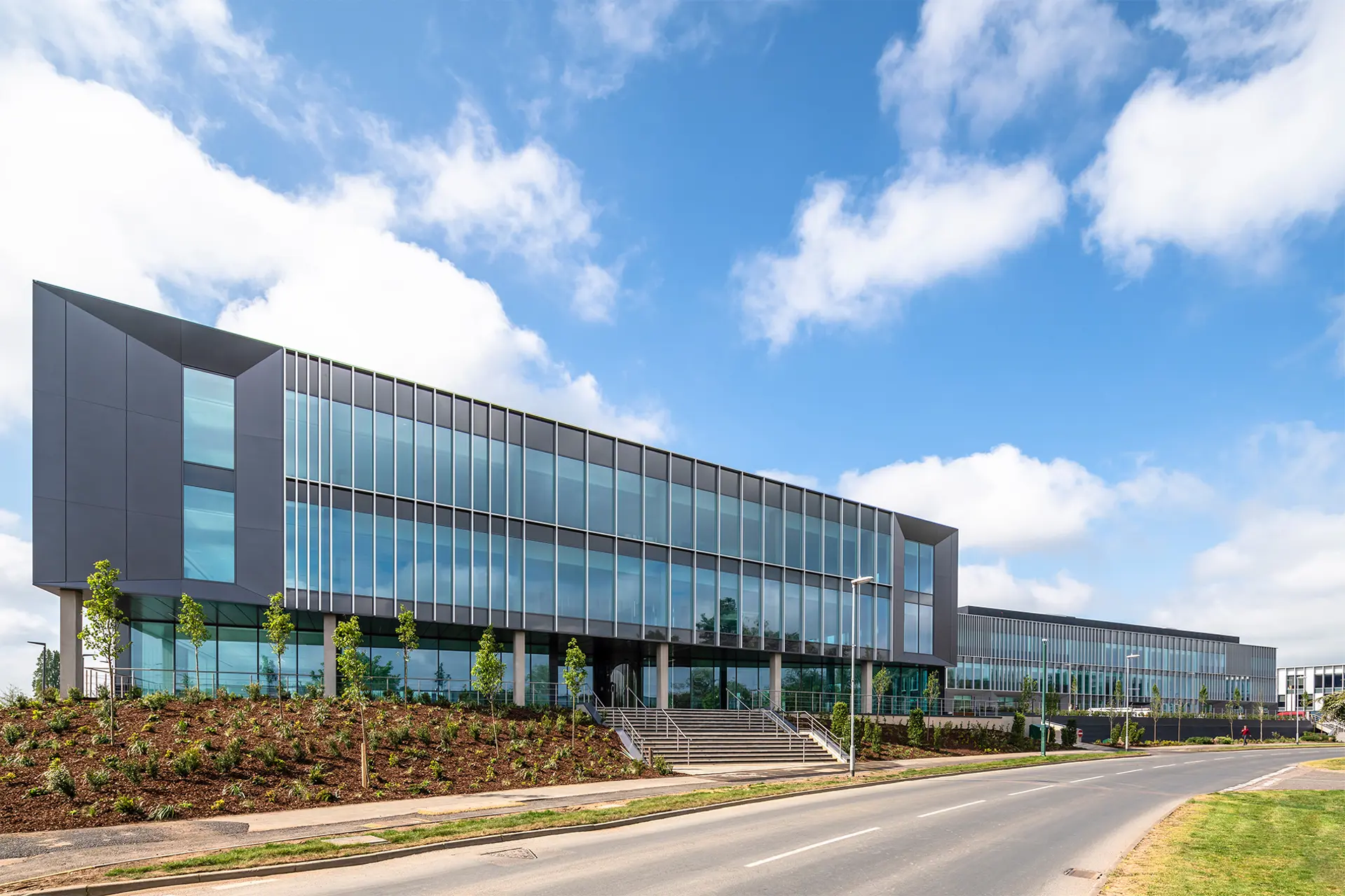 “Both buildings achieve a dynamic aesthetic due to their elevated position and were designed to make a statement for the future of the Cambridge Science Park and to influence high quality design in future buildings.”