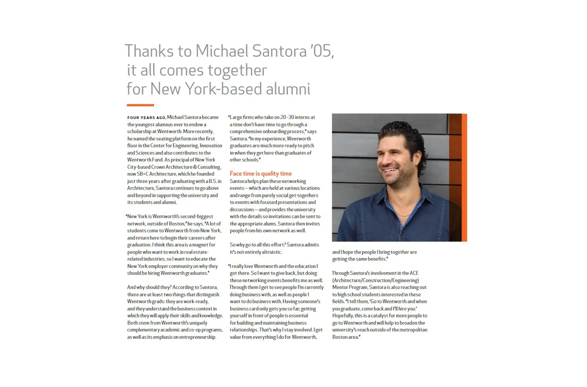 In the President’s Report Michael is lauded as the youngest alumnus ever to endow a scholarship at Wentworth. He continues to assist the university, students and alumni; he is committed to supporting and discovering new generations of architects and engineers with an entrepreneurial edge.