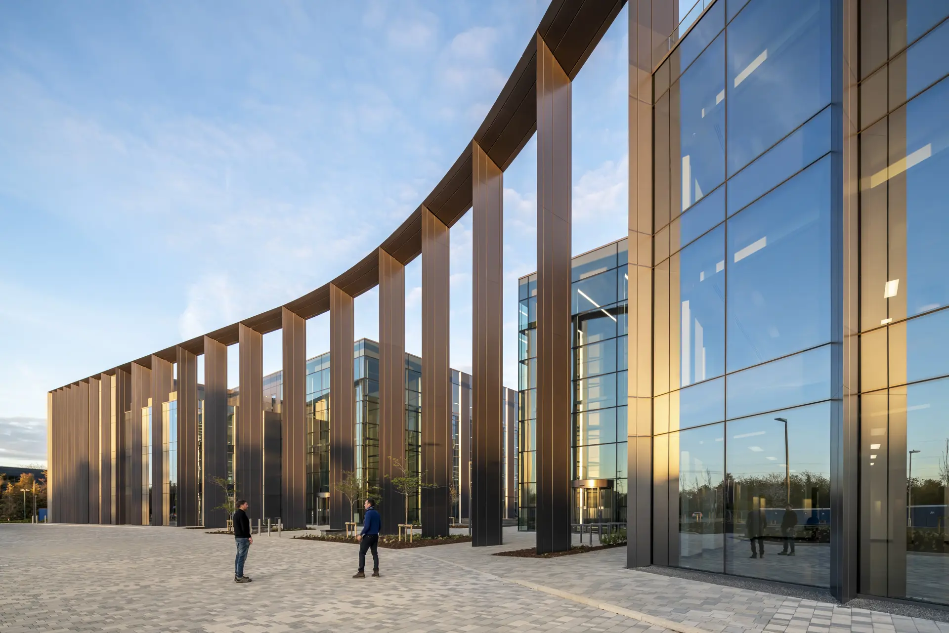 The entrance colonnade fins lay flat against the side elevations, creating a rhythmical façade system. These vary across the width of each building to provide office spaces with ample daylight without exceeding solar gain. As well as creating a new area of public realm between