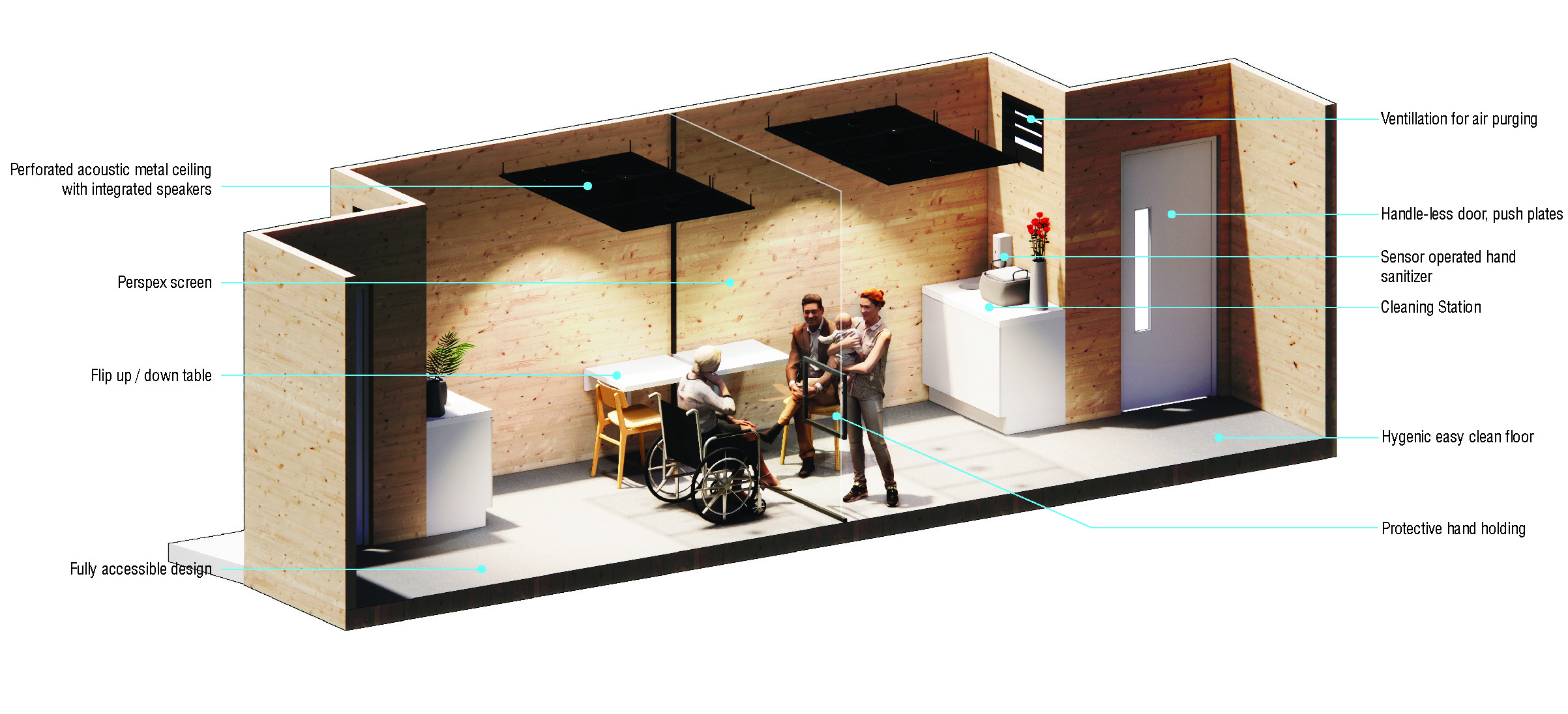 Each side of the partition incorporates a handle-less door, ventilation, a cleaning station with a sensor operated sanitiser and a flip up/down table. A perforated acoustic metal ceiling has integrated speakers to support communication.
