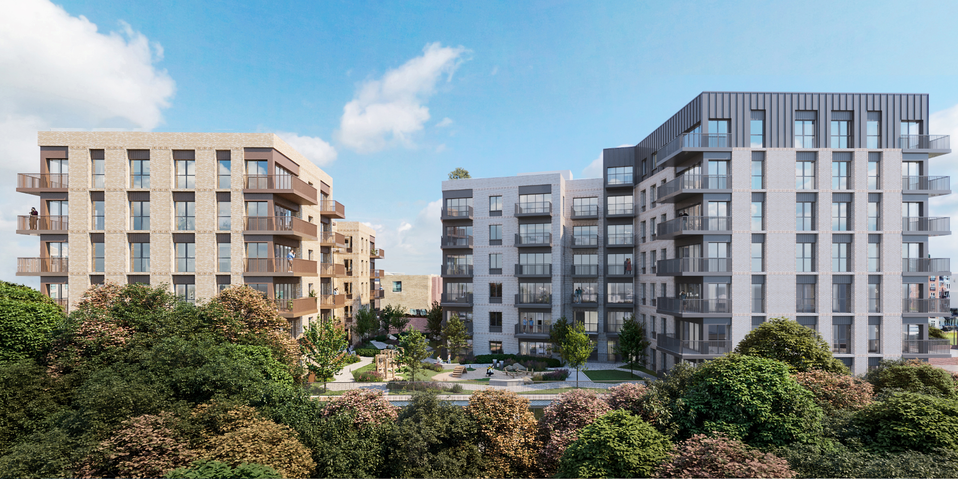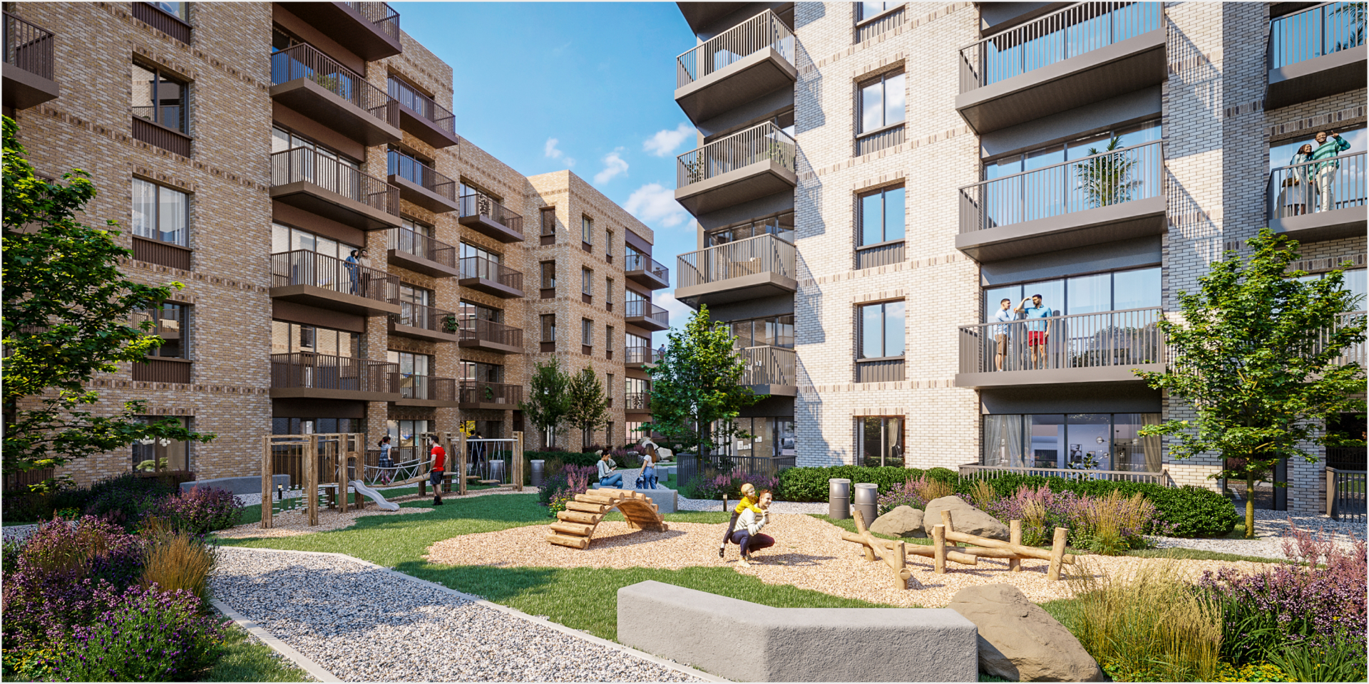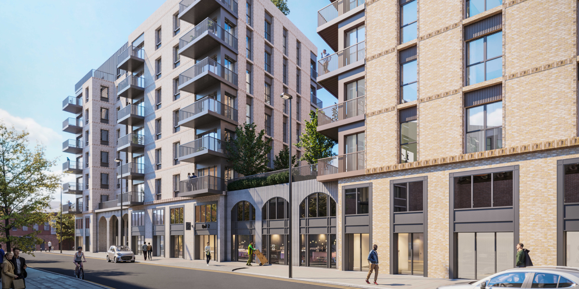 Two residential blocks, ranging from five to seven stories in height, wrap around a raised central landscaped courtyard while flexible light Industrial units activate the ground floor frontage along Commerce Road. Above, a mix of one to three bed homes for private sale and affordable rent, are designed to accommodate people of all ages.