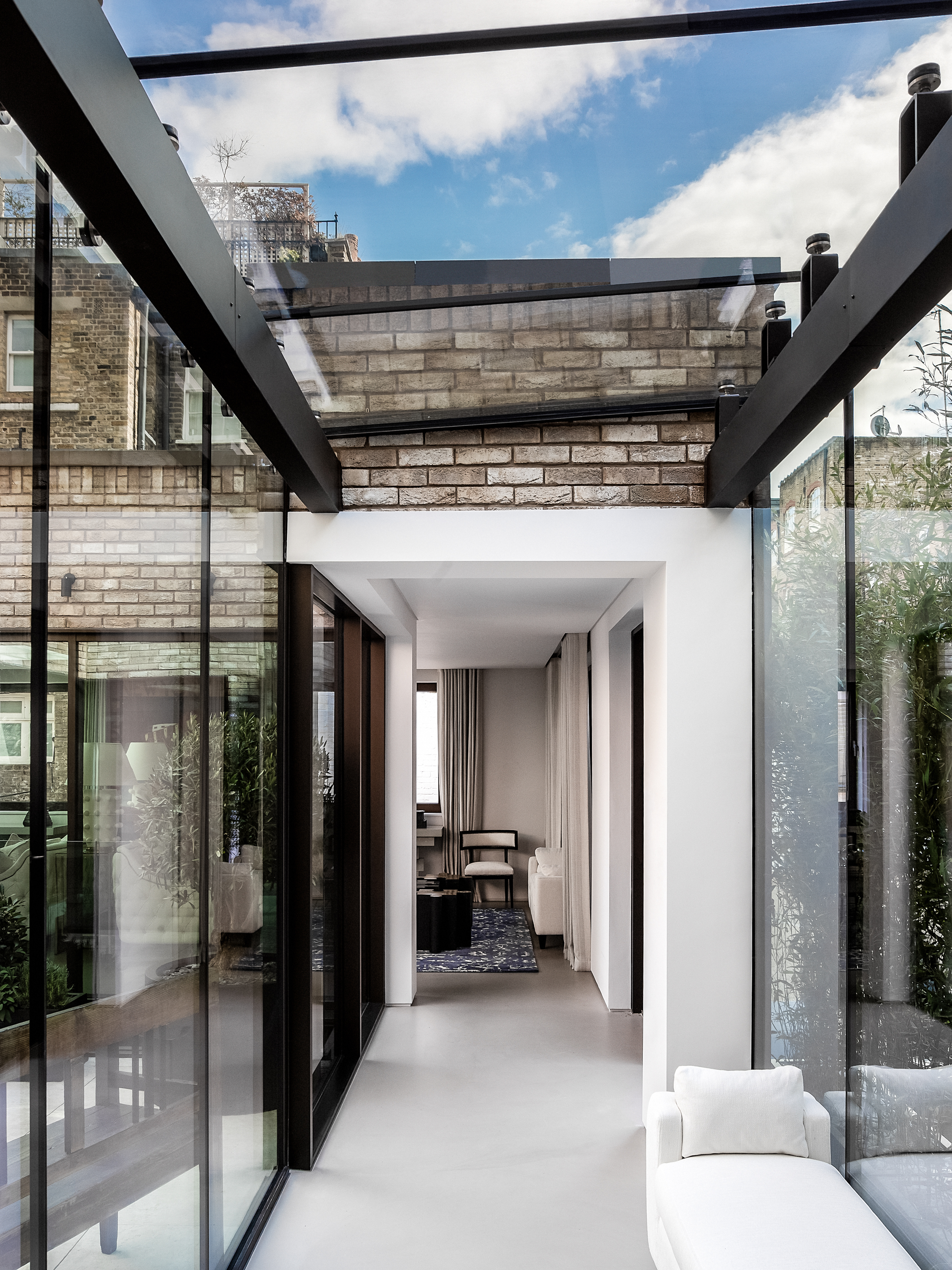 Conceived as two co-located elements, the 759 sq m townhouses are positioned around a courtyard to introduce light, space and privacy on a site tucked away from Old Church Street. A modern interpretation of a traditional Chelsea townhouse, their design is contemporary and light, with clean lines and form complemented by high quality materials: brick and bronze anodised aluminium cladding.