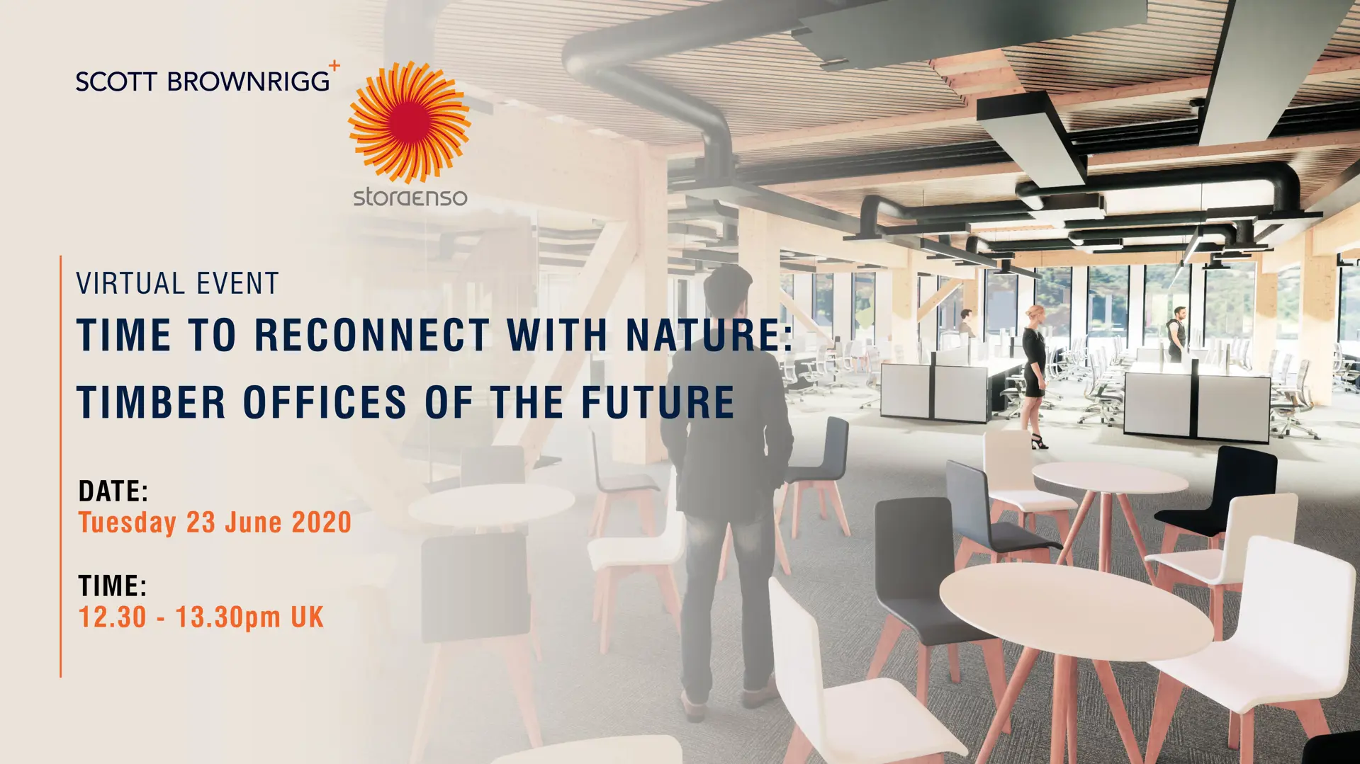 Scott Brownrigg and Stora Enso invite you to a virtual event exploring the future of the office workspace on Tuesday 23 June from 12.30-13:30pm UK. As part of London Festival of Architecture Digital, we will demonstrate how advanced design techniques are enabling the creation of timber office spaces which can reshape our working lives, pushing sustainability, flexibility and wellbeing to the top of the agenda.