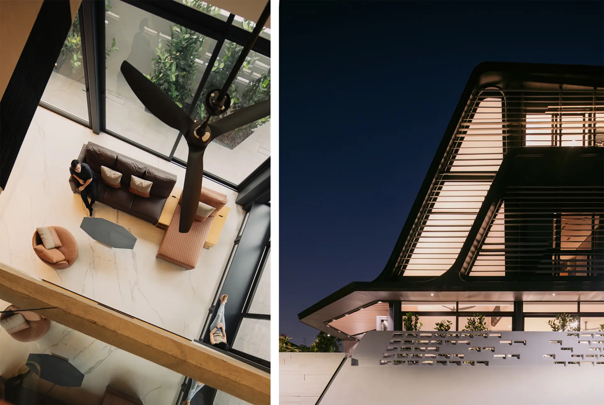 The layering of varying heights creates an internal space that connects the family in a fun way and weaves around the central steel staircase. The staircase is the protagonist, connecting the vertical levels, allowing for cross-ventilation and becoming a feature metallic patterned screen to diffuse the triple volume daylight from the third level roof skylight.