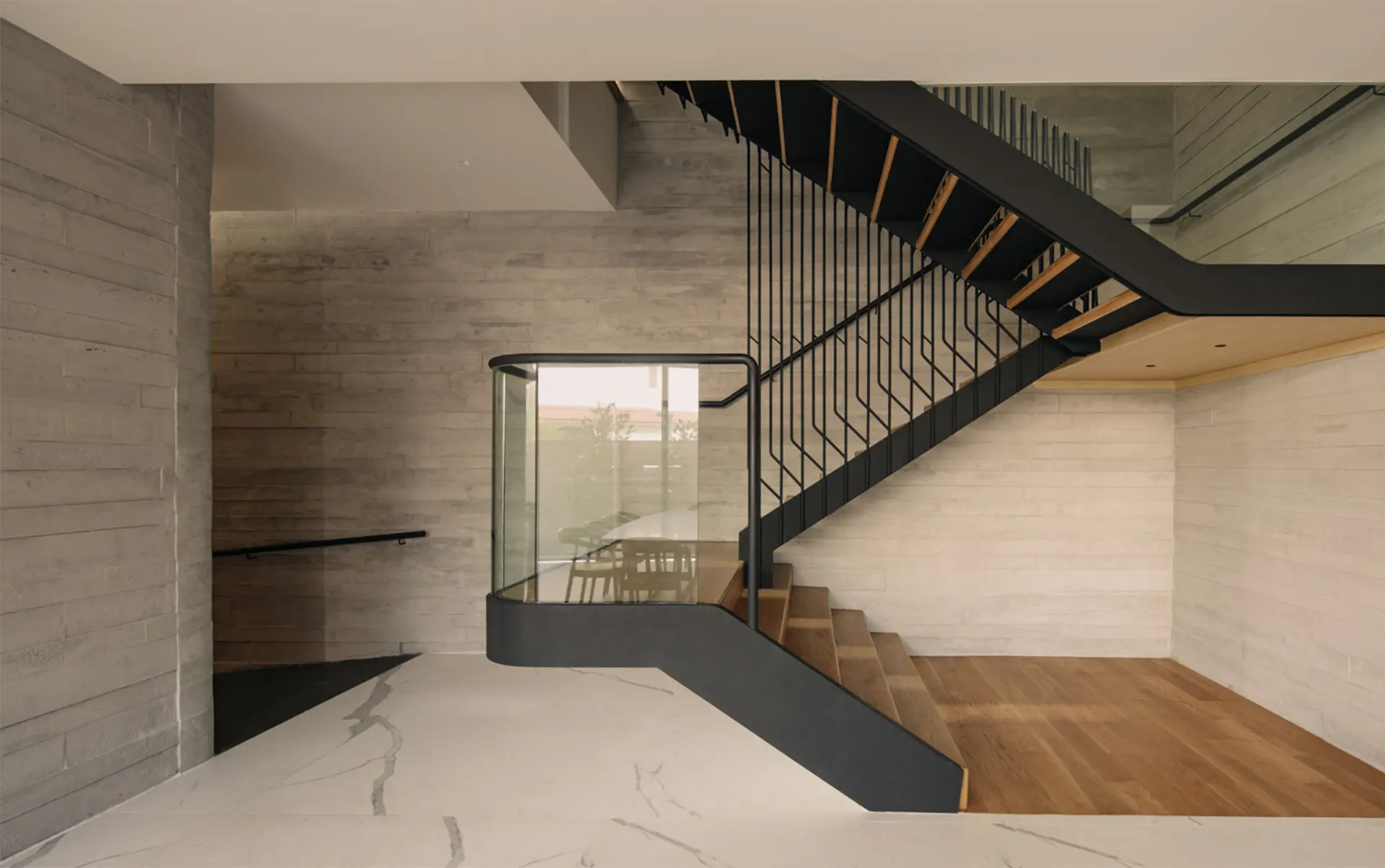 The interesting internal spaces have been created with an innovative palette of materials that include off-formed concrete texture, timber grain and an industrial steel matte lustre. These have been thoughtfully selected to provide a backdrop for the daylight and create a play of shadows. Materials were selected for their low-maintenance attributes; reducing energy consumption in the future. This palette extends through to the internal furnishings with bespoke furniture and cabinets. The internal environment blurs the boundaries with the surrounding outdoor landscape, which is accessed via the double-height main living areas.