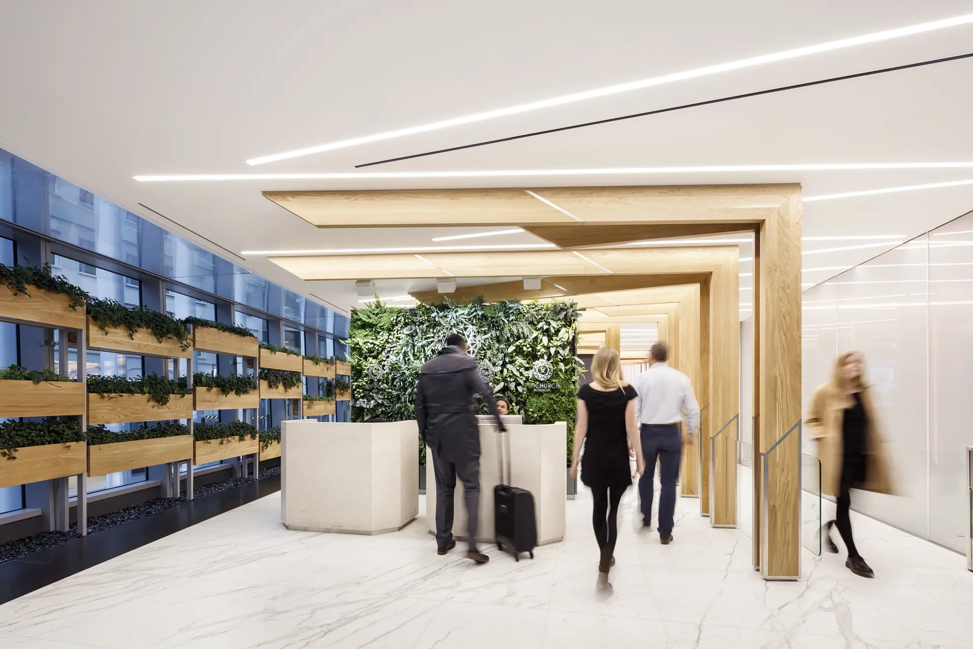 The innovatively designed interior provides a contemporary twist on a garden, this is depicted through the incorporation of bespoke `trees` and planting which lead the visitor through the space, whilst the lighting design symbolises dappled light through the branches of trees overhead. These elements, together with the living wall located behind the reception effectively help in building a sense of anticipation of the sky garden.