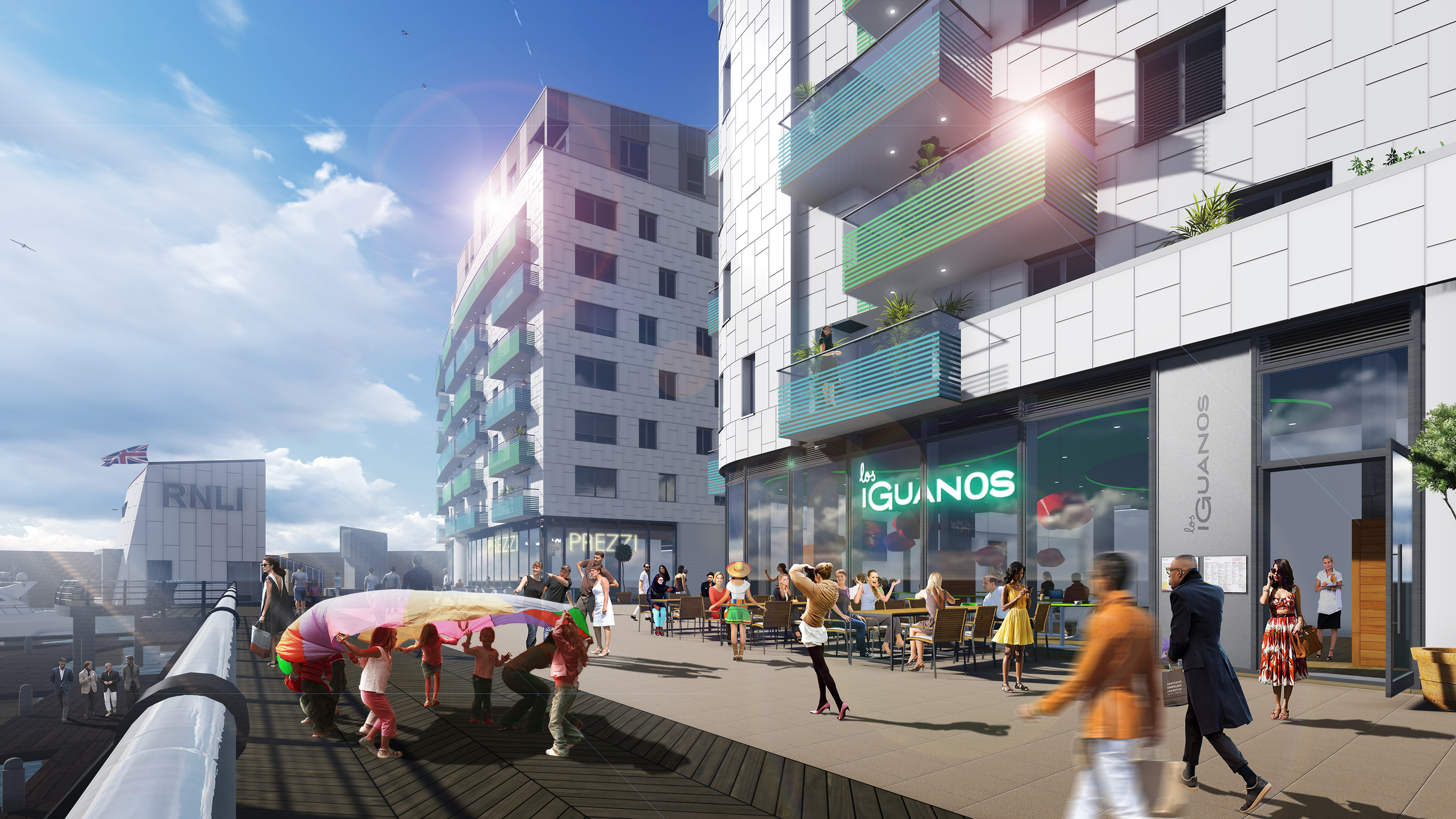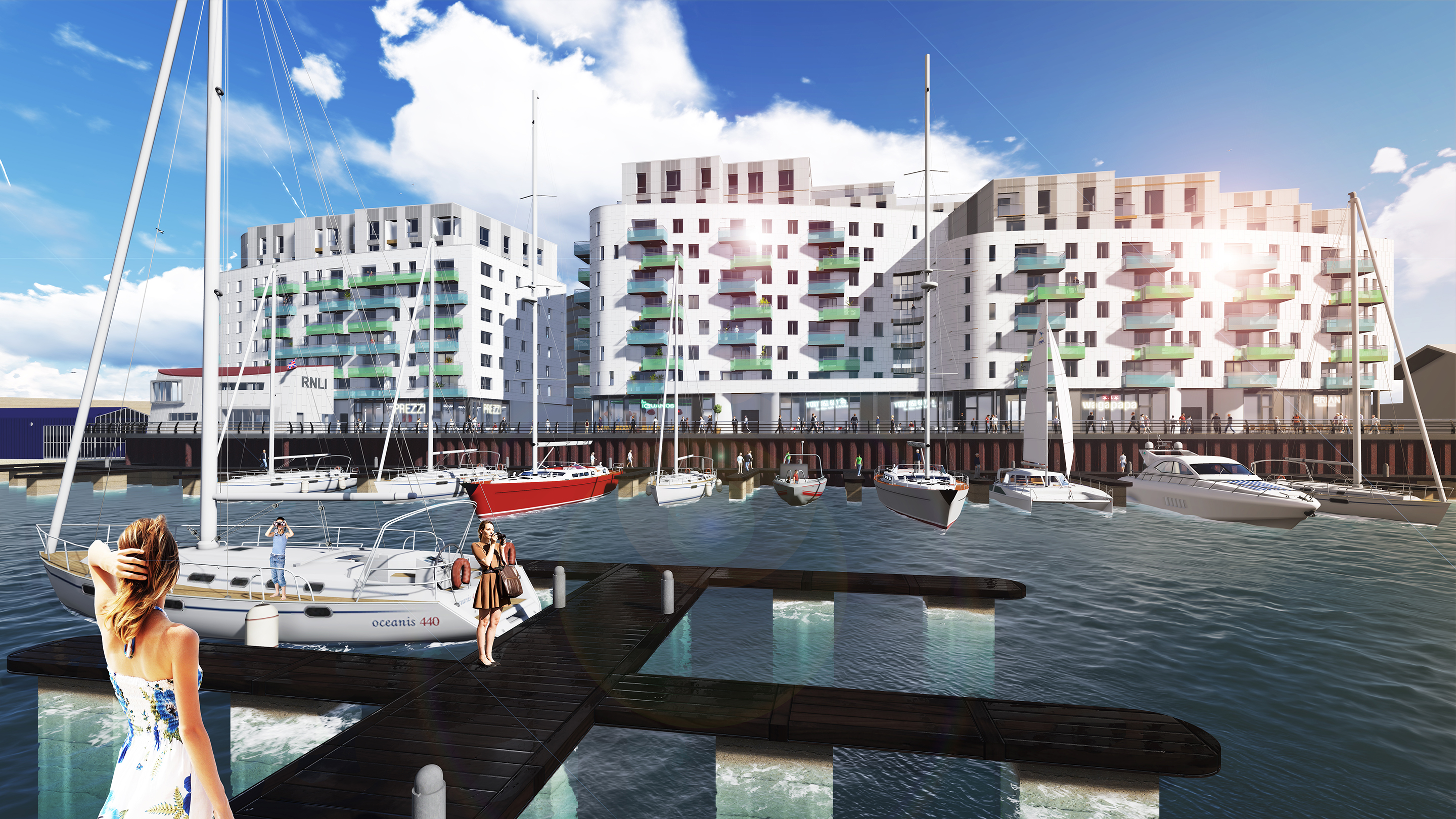 We reconfigured the layouts of both apartment buildings, introducing more appropriate retail use at pedestrian/ promenade levels, increasing the floor to ceiling heights in these commercial units and introducing a performing arts area adjacent to the marina. The West Quay seawall was broken through which allow the car park entrance to be relocated, simplifying the access, the structure and the internal layout. This change improved traffic flow site wide, resulted in an additional eight car parking spaces and improved facilities for disabled users. A window on the RNLI building was relocated to allow greater visibility into the outer harbour, in case of emergency.