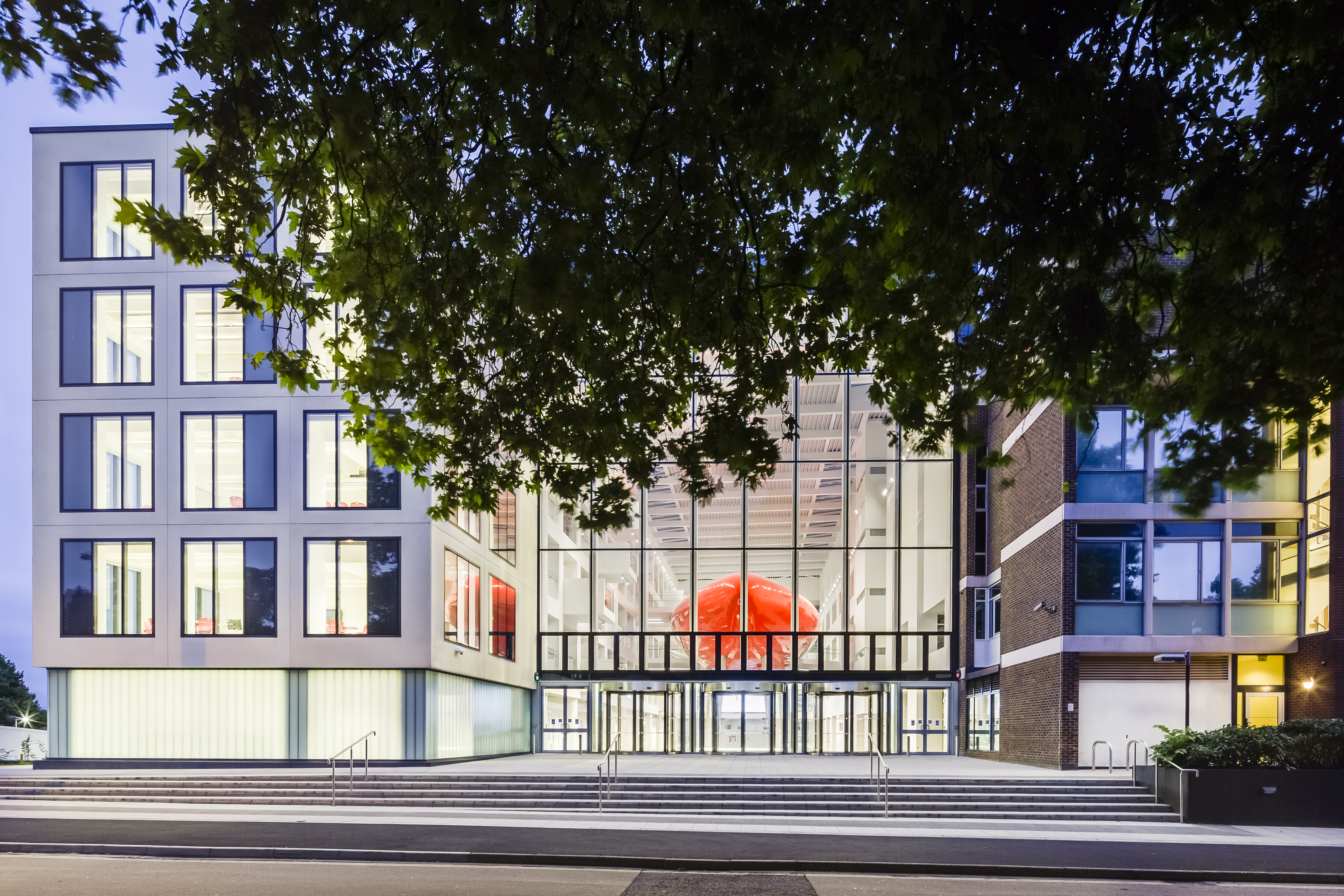 Movement of the trees, people in the park and atrium are reflected in the high gloss finish of The Pod which appears to glow red at night as light emanates from the building.