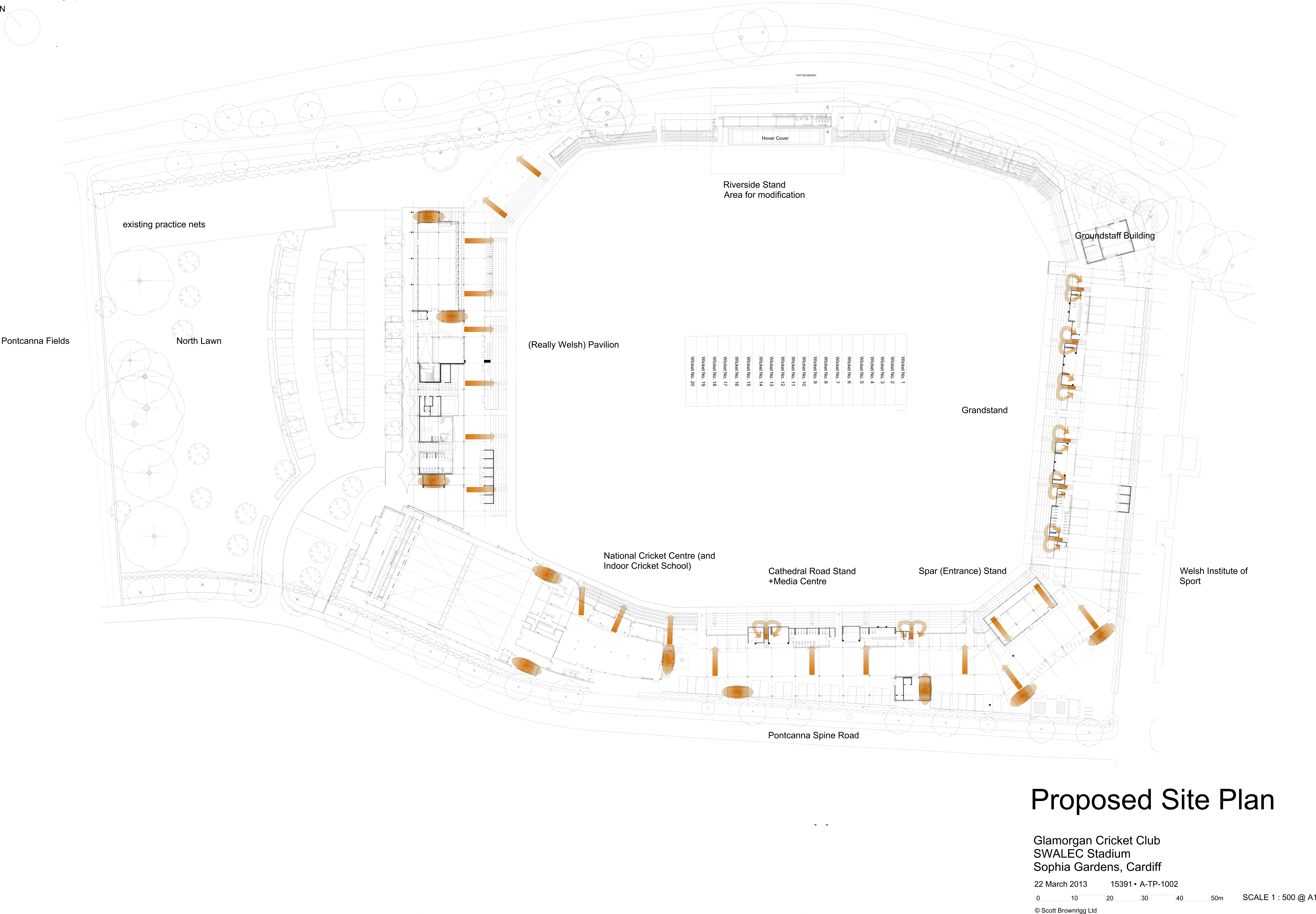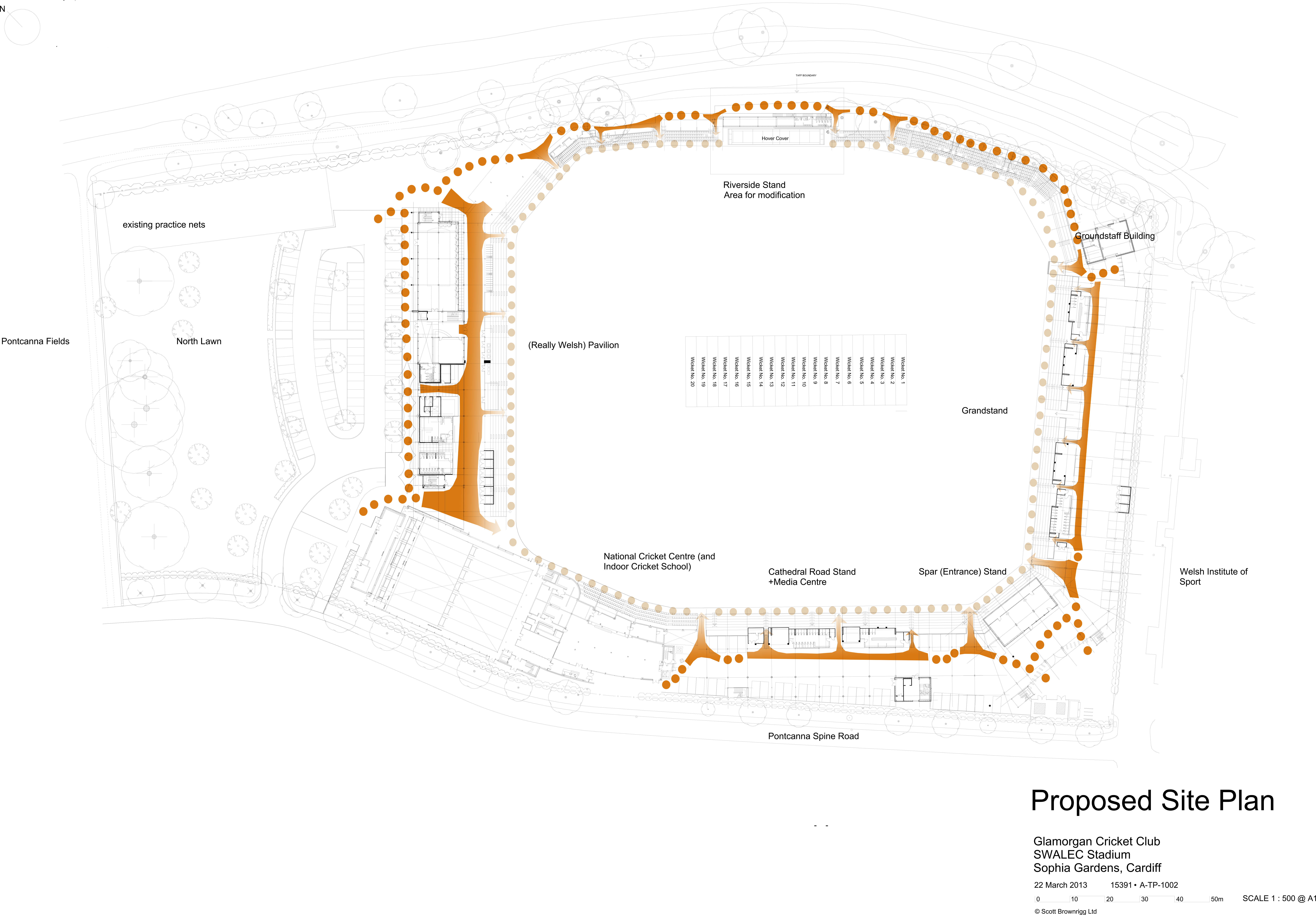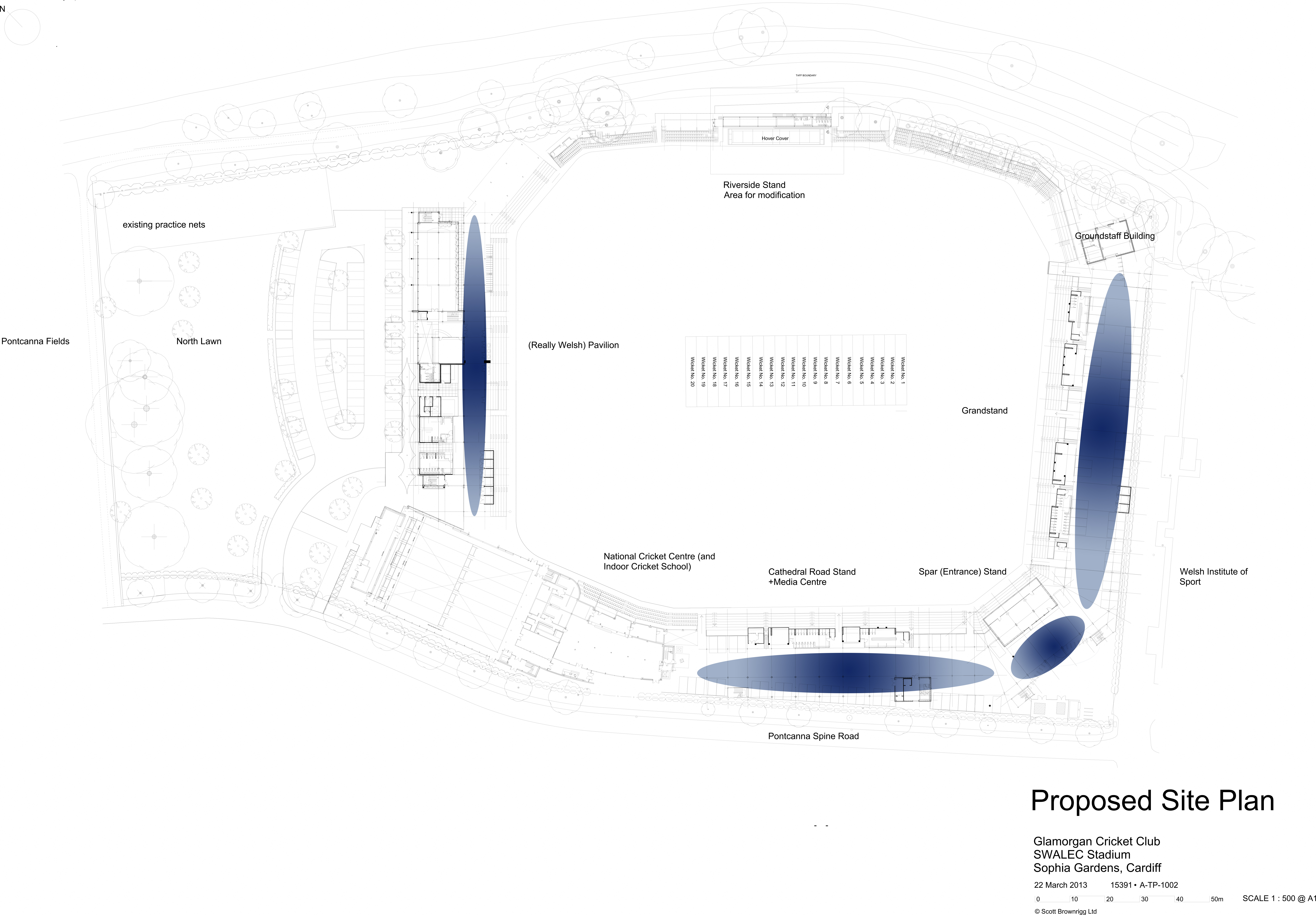 We shall discuss how this dual performance or sporting ‘dance’ can be facilitated by the configuration of the stadium later. First we will look at the prologue – the very act of arrival and how this consideration effects the organisation and planning of the SWALEC Stadium. The first part of the stadium was developed in 1999 for the Cricket World Cup with the client Glamorgan County Cricket Club (GCCC). Cardiff was selected as home to the Australian team (tournament favourites) and the ground had benefited from the largest Sport Lot donation of £3.6M which had delivered a new National Indoor Cricket School, hospitality facilities, administration and 1,800 permanent fixed seats.