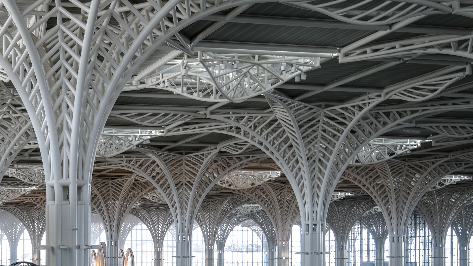 Latticed patterns created by the steel frame not only provide structural integrity, but also enhance the terminal's beauty by allowing natural light to filter through, creating dynamic light and shadow play throughout the building’s interior.