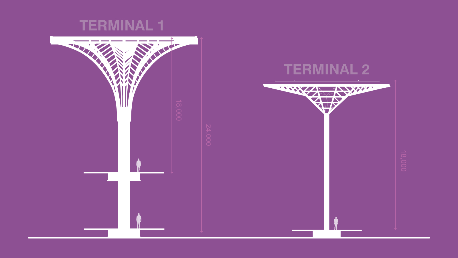 The positive tensions and dialogue created between the individual palm tree structures of both terminals are a clear expression of the positive contribution of meaningful contrast and juxtaposition in architectural design. These calculated differences in approach will be experienced by passengers when they use and pass through the dual facility. It is the fundamental differences and contrasts in the architectural expression of the co- existing palm groves that will offer gentle and ambient resonance for passengers on their way through either or both spaces. Were both structural solutions to be identical, the homogeneity of such an approach would have diminished the journey through these significant and elegant spaces.