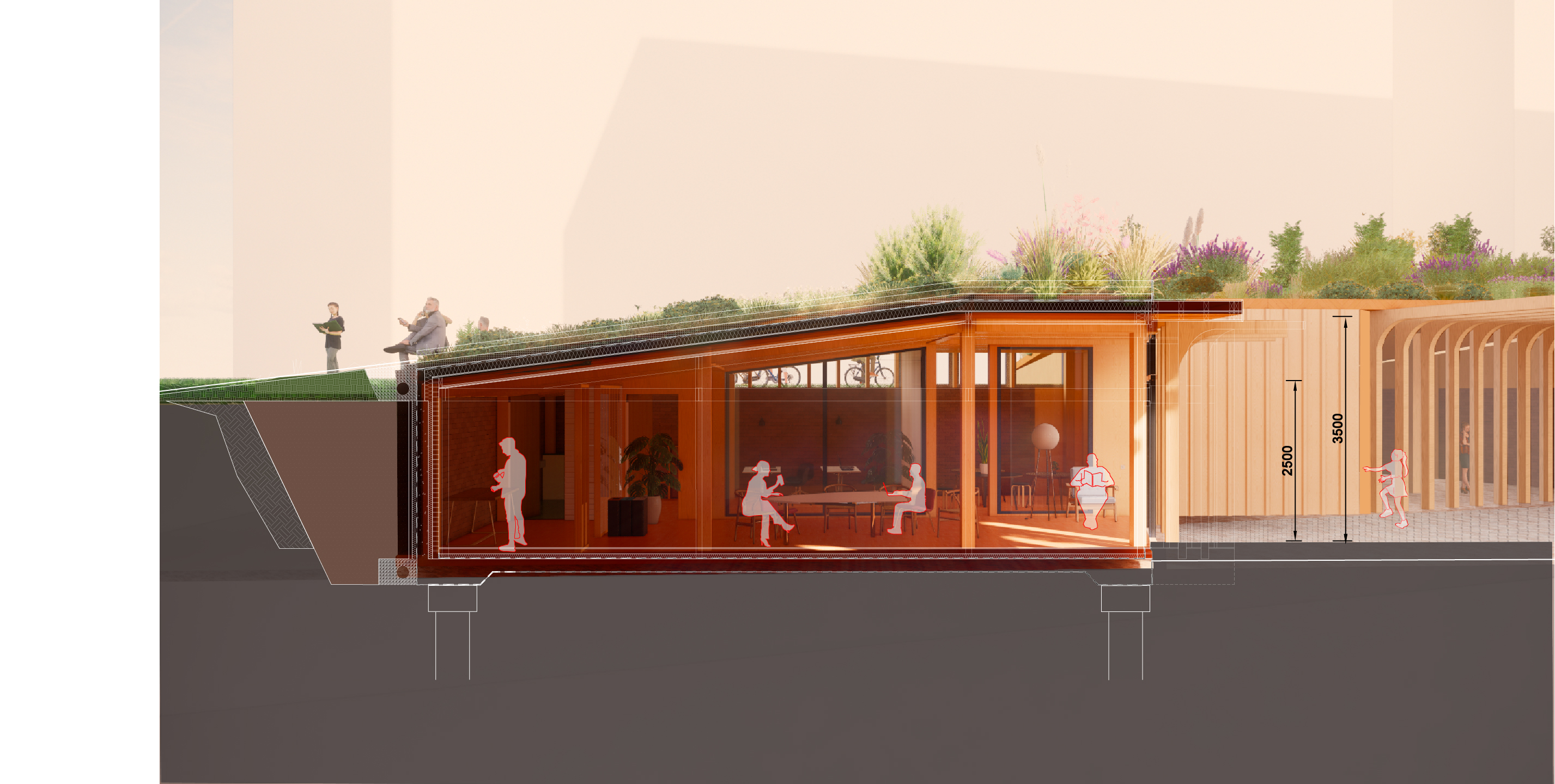 The typologies and their forms are to act to attract the inquisitive nature of people. For this reason the Upskil lcentre is embedded into the public realm, with the skills centre located in Lewis Cubitt park. The intention to incorporate the connectivity and carbon aims by retaining and improving the park and making more accessible - so in balance the essence and activity of the park life within the accessibility of the centre and its programme of spaces. Retaining and enhancing the biodiversity.