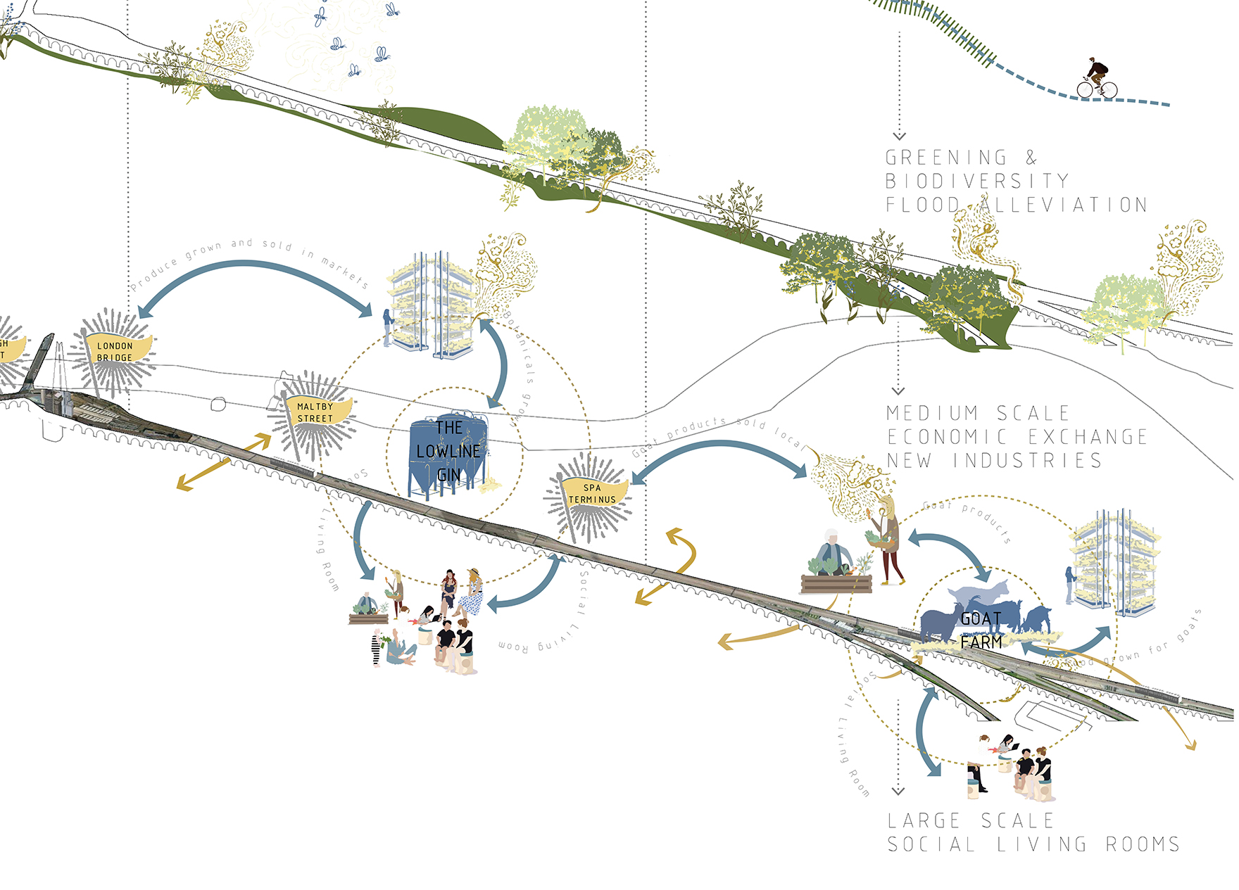 In our proposal, new businesses attracted to the area will utilise innovative techniques such as vertical farming and urban greenhouses, where botanicals can be grown and harvested. Products from these urban farms are sold to The Low Line Gin distillery located a few arches over. The Low Line Gin could then be sold to a bar in an arch further down the route. We envision the by-products of the gin production and consumption creating further opportunities, for example, soap manufactured from spent botanicals. The idea is that this ‘economic exchange’ amongst the occupiers of the arches would result in a community of shared materials and by-products, resulting in a local sustainable economy aiming towards zero waste.