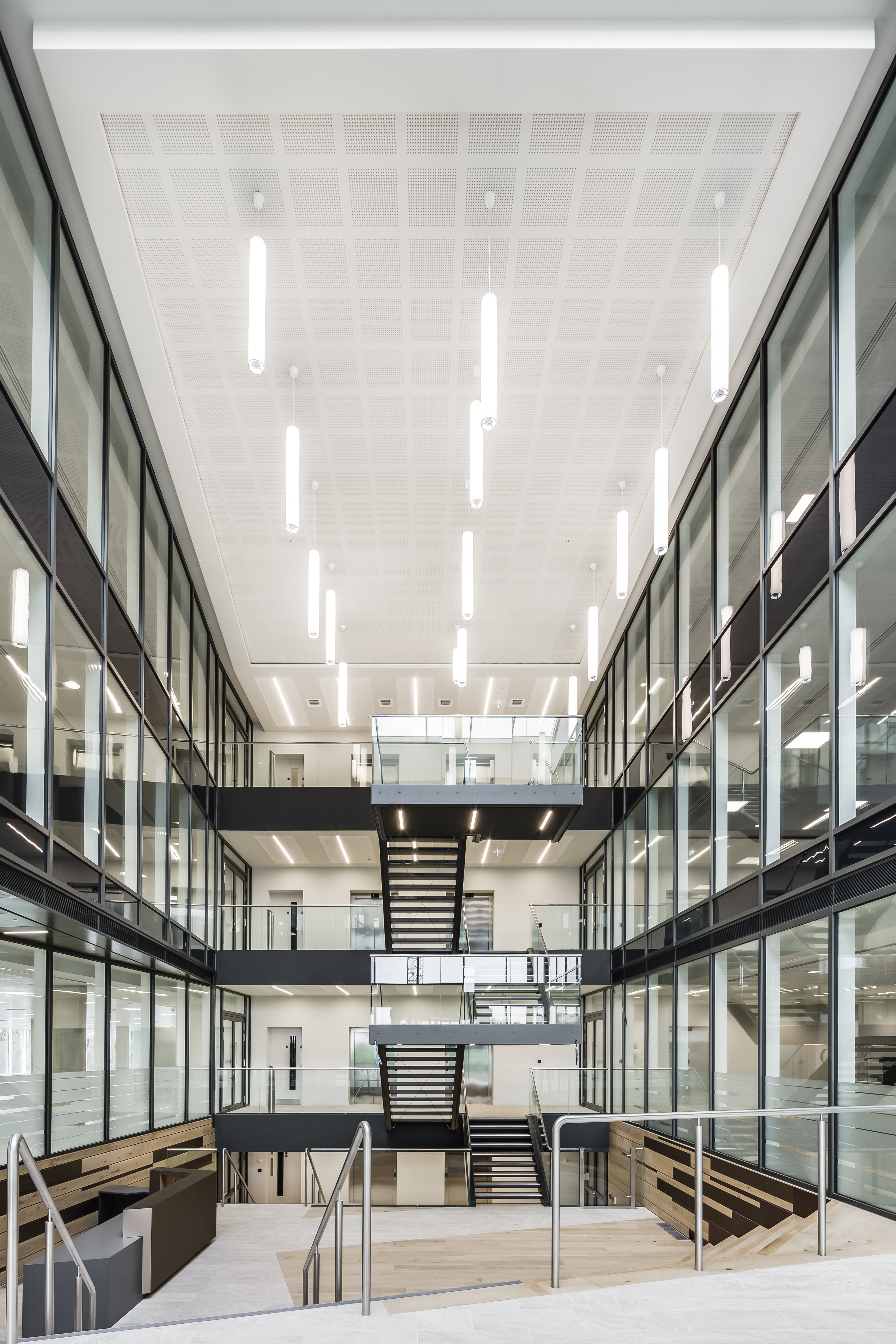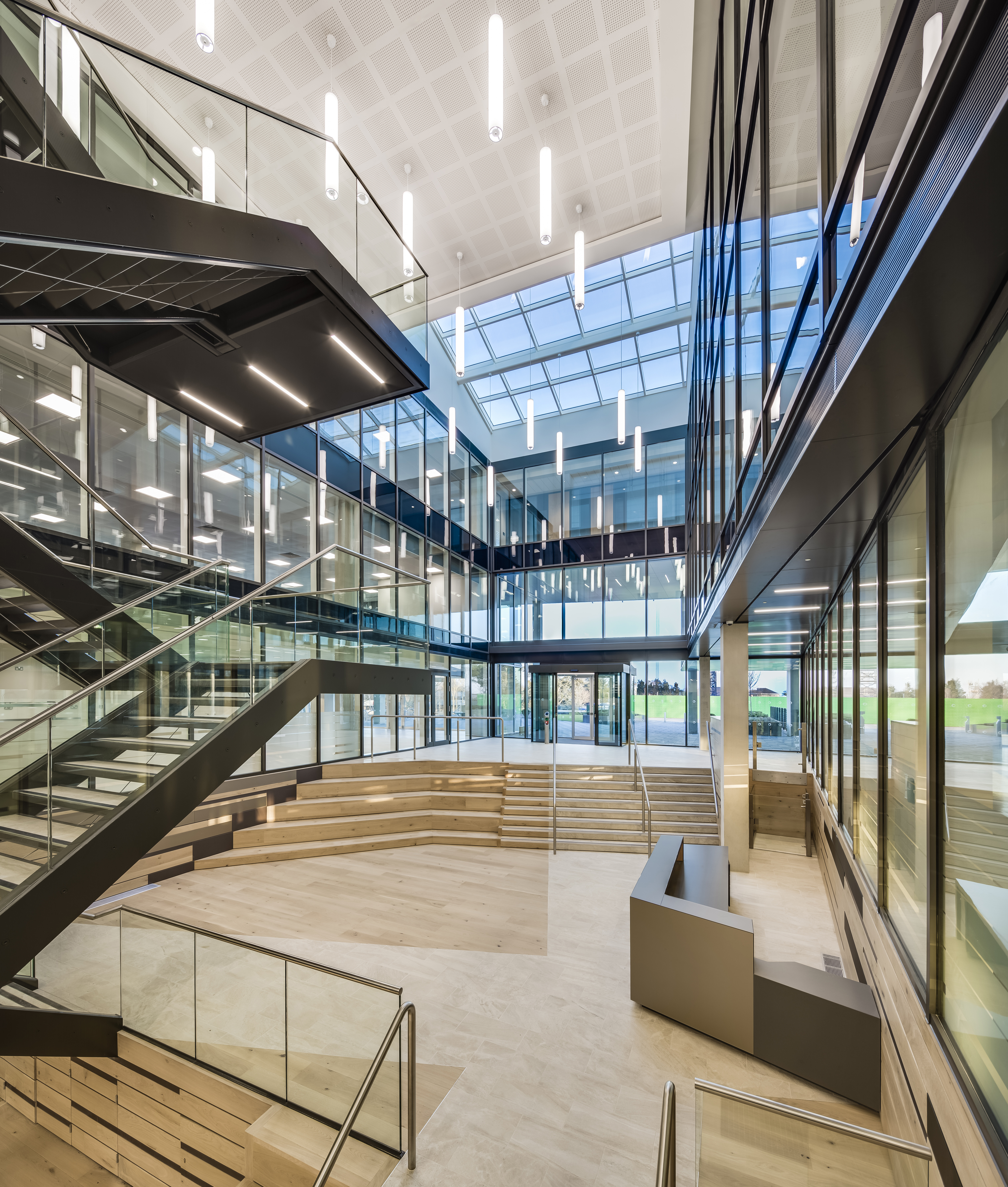 Our design, awarded BREEAM Excellent, places the building on a landscaped podium, over under-croft parking. This provides an impressive arrival experience for clients and staff. Our three-storey design incorporates a full height atrium and column free working spaces. Façade materials create a sleek and minimal appearance.