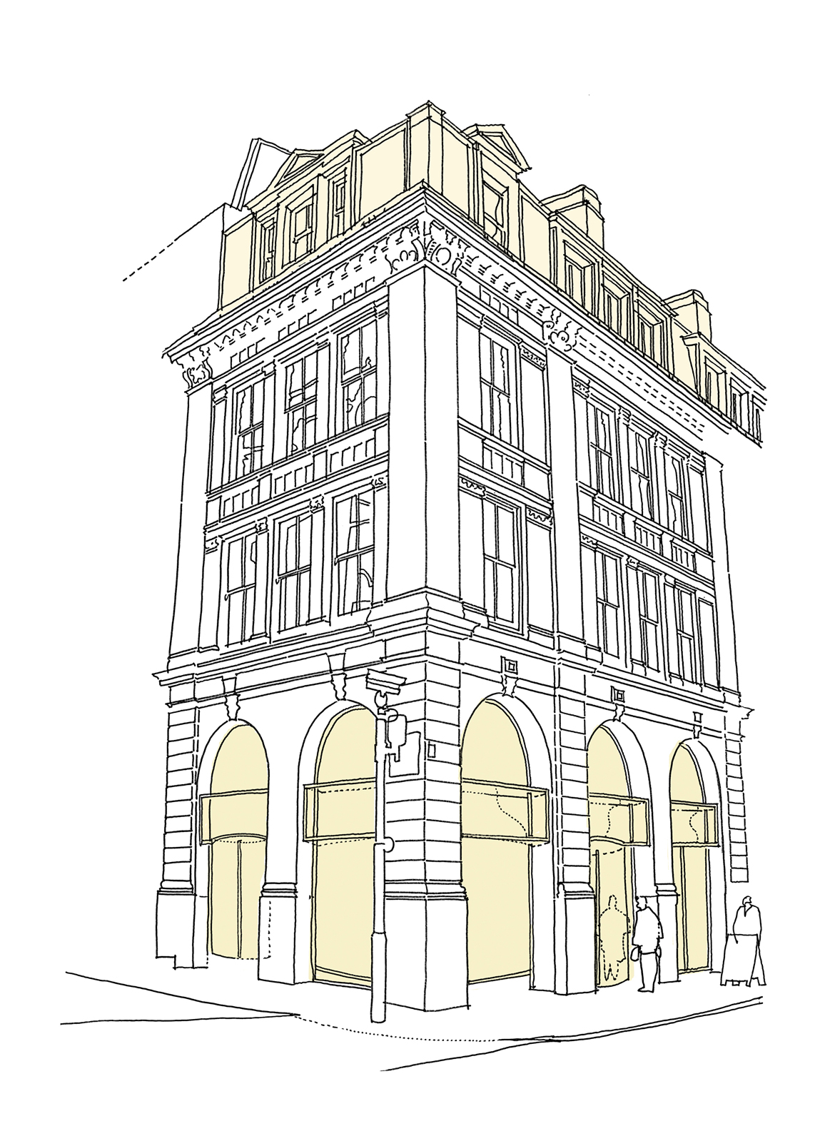 Above the main parapet line, the office space is set back and expressed as a simple glass enclosure lit by a central atrium space. You enter the offices through the central arch of Lonsdale Chambers via a new sinuous glass canopy, providing a contrast to the monolithic character of the stone façade.