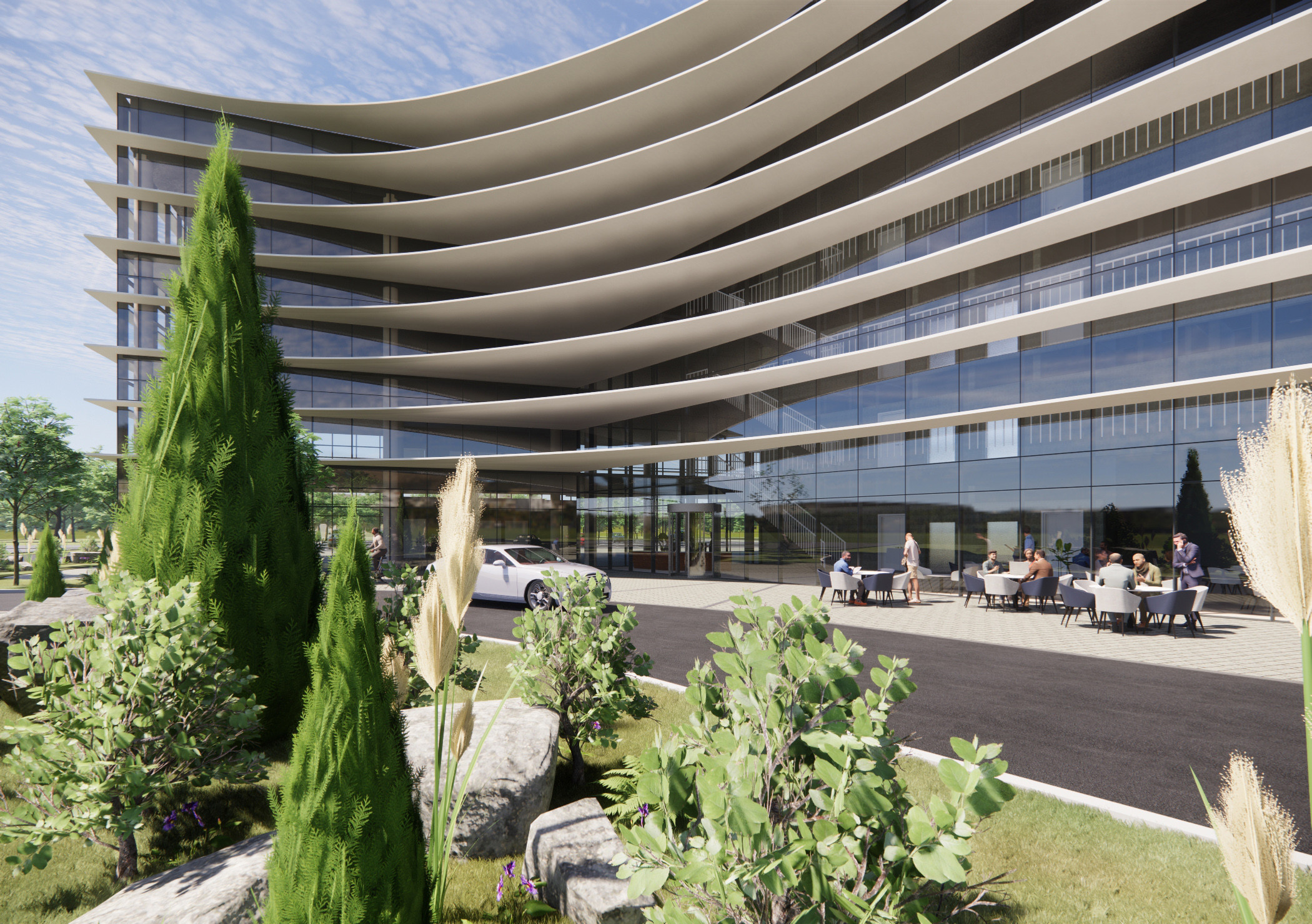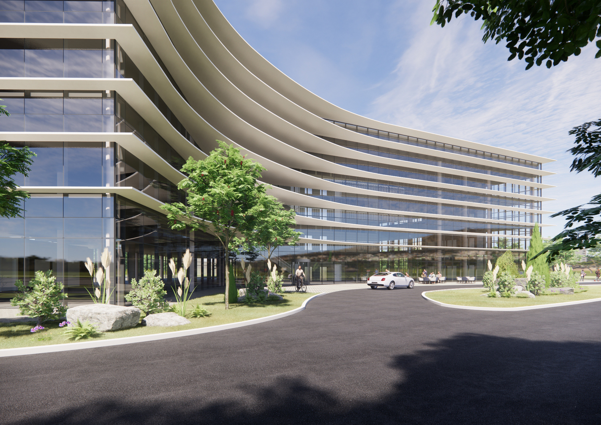 The main atrium is protected from solar gain with a sweeping curve of solar shading that screens low-level sun whilst allowing an abundance of daylight to pour into the heart of the space. This sweeping arch forms a distinctive and iconic presence on the site, and signifies the drop-off and main entrance.