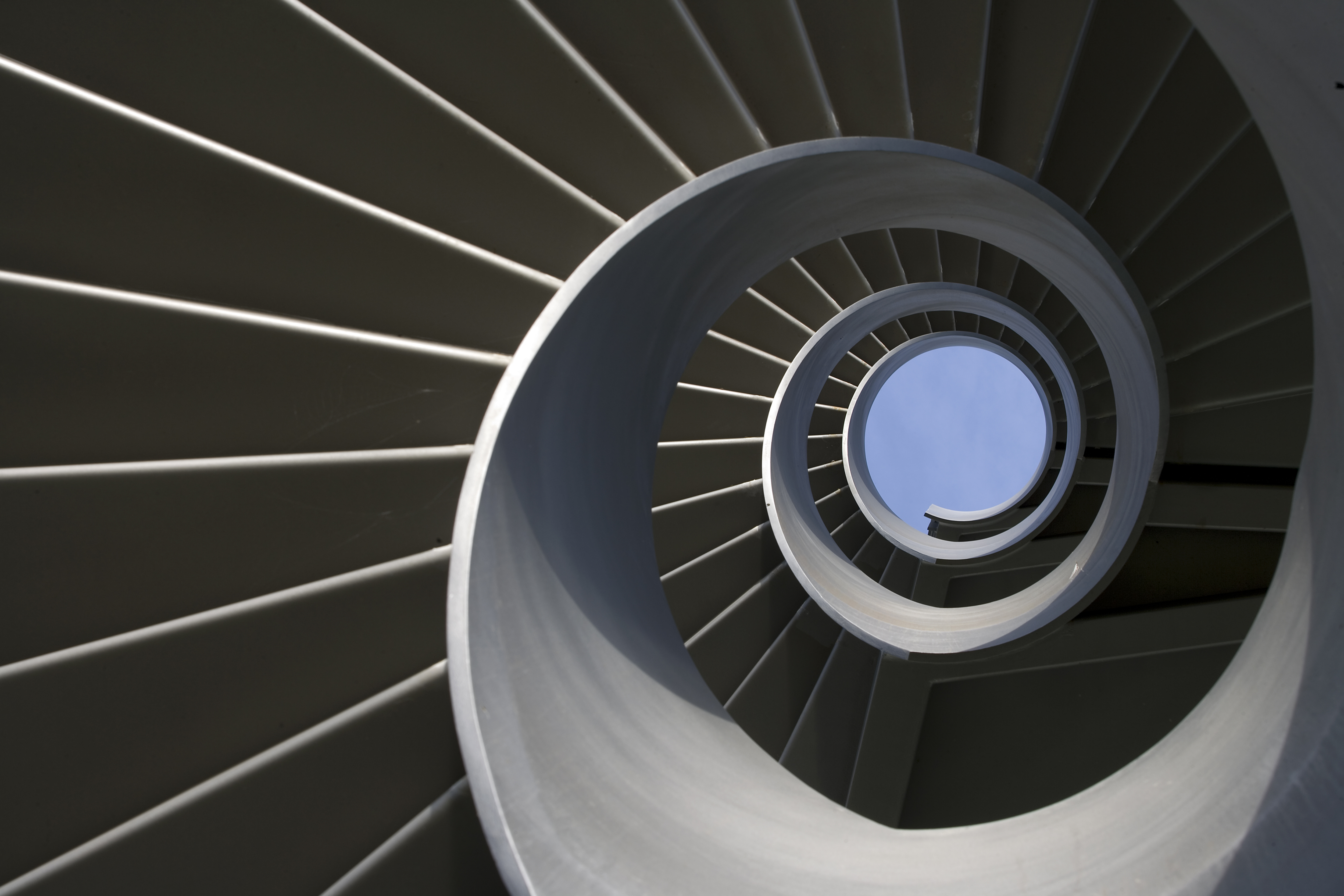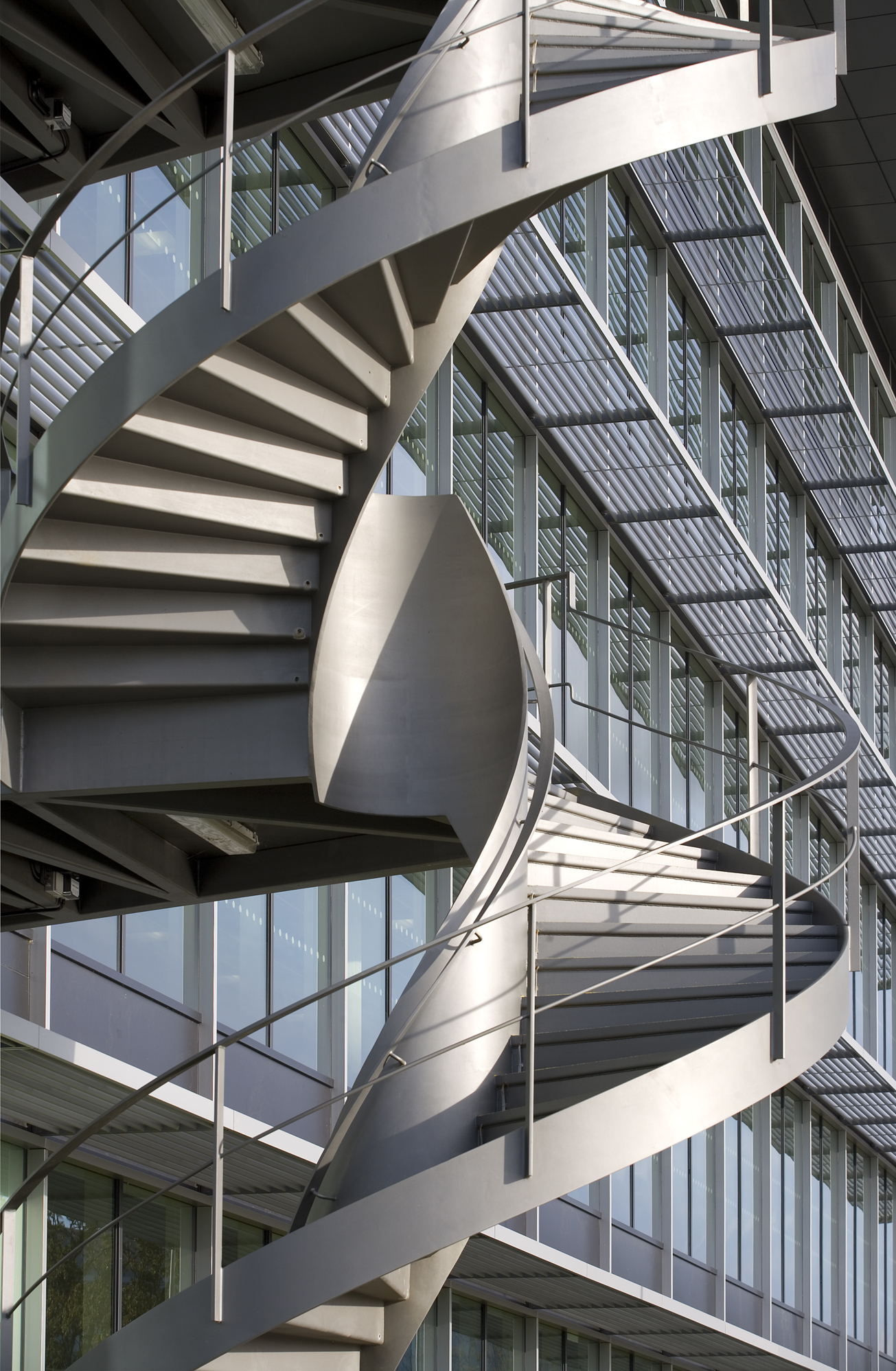 We designed two external staircases as sculptural features. These are unique in their integral structural support and use an inner string cut from a single steel tube, which takes the form of a helix ribbon.