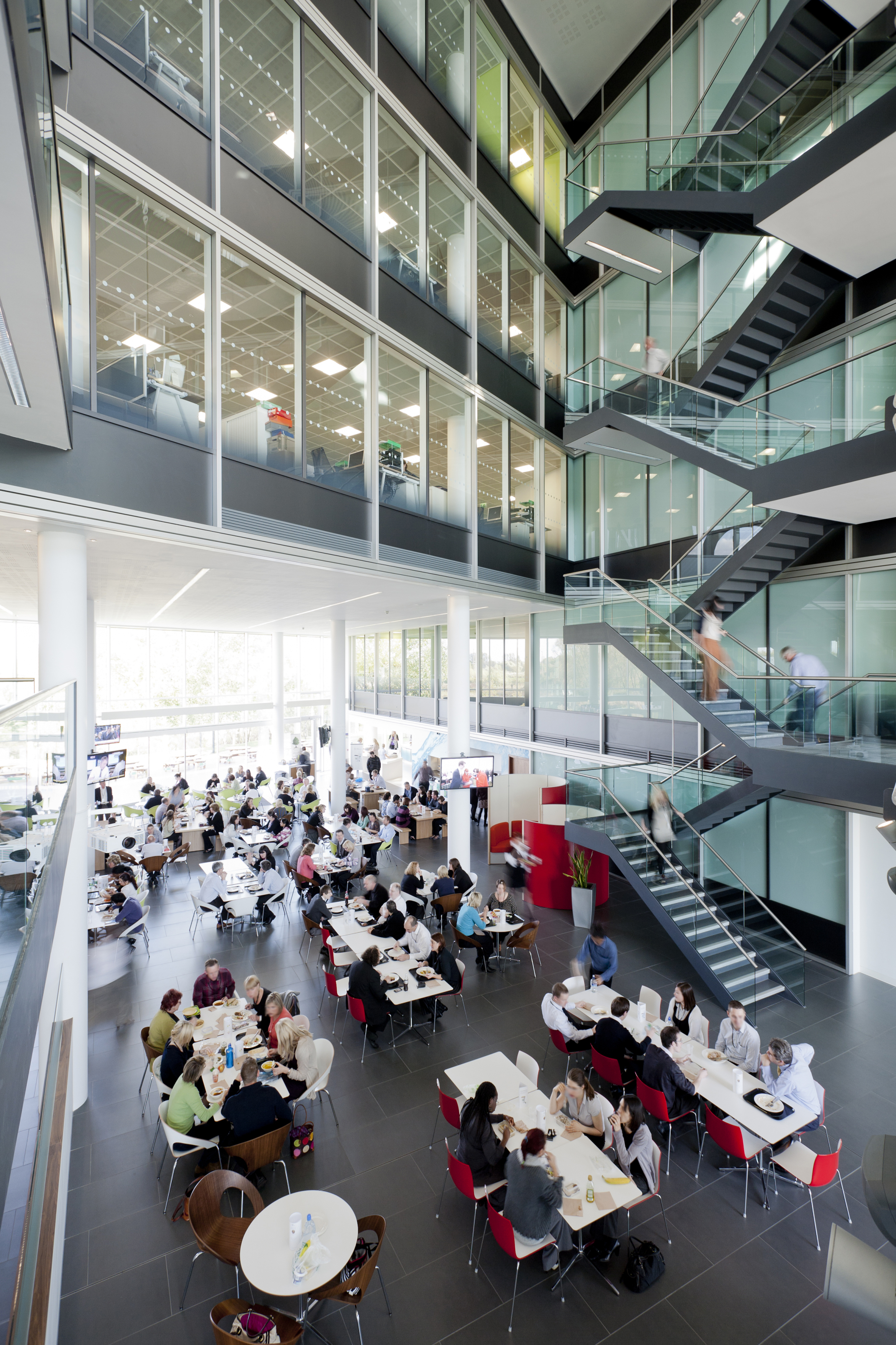 Our bold sculpted design wraps around a full height central atrium. At ground and first floor the two parallel wings are joined by the entrance hall to a split service core. Three further floors form a ‘U’ shaped single space that wraps around the entrance hall. Cantilevered bridges connect the two wings on the upper levels.