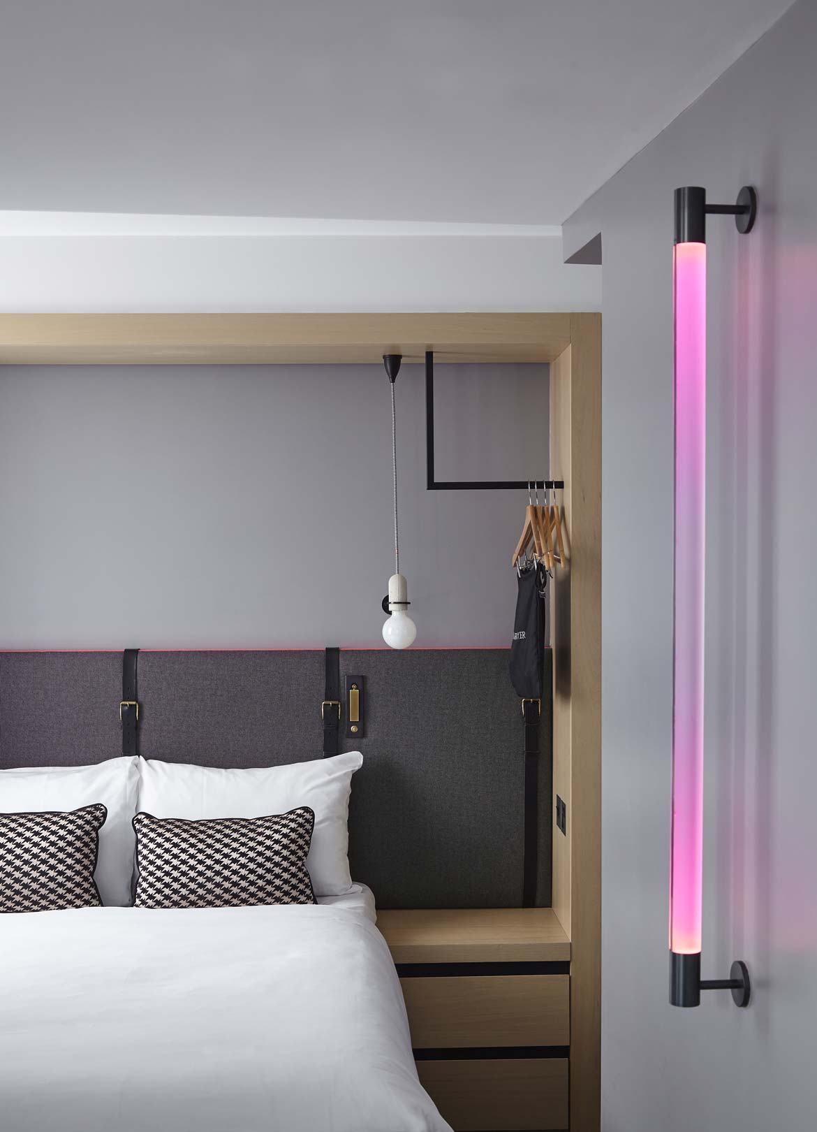 Each of the bespoke designed headboards incorporate a safe whilst the efficient design of the hanging rail and storage makes use of the snug size of the bedrooms. Two reading lights and a unique pedant, as well as a built in shelf for charging phones/tablets has been incorporated in the rooms which can be easily adapted to create multiple room types and offers, as well as locations.