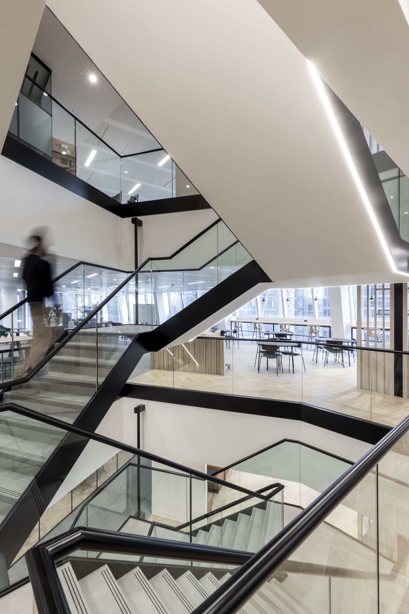 Incorporating a hospitality approach to the office design, the open plan space consists of a variety of micro working environments, each designed to encourage interaction and cater to individual need. The floors are linked by a central cantilever staircase which provides an impressive focal point to each floor as well as enabling staff to easily travel around the office, supporting Chaucer’s collaborative culture.