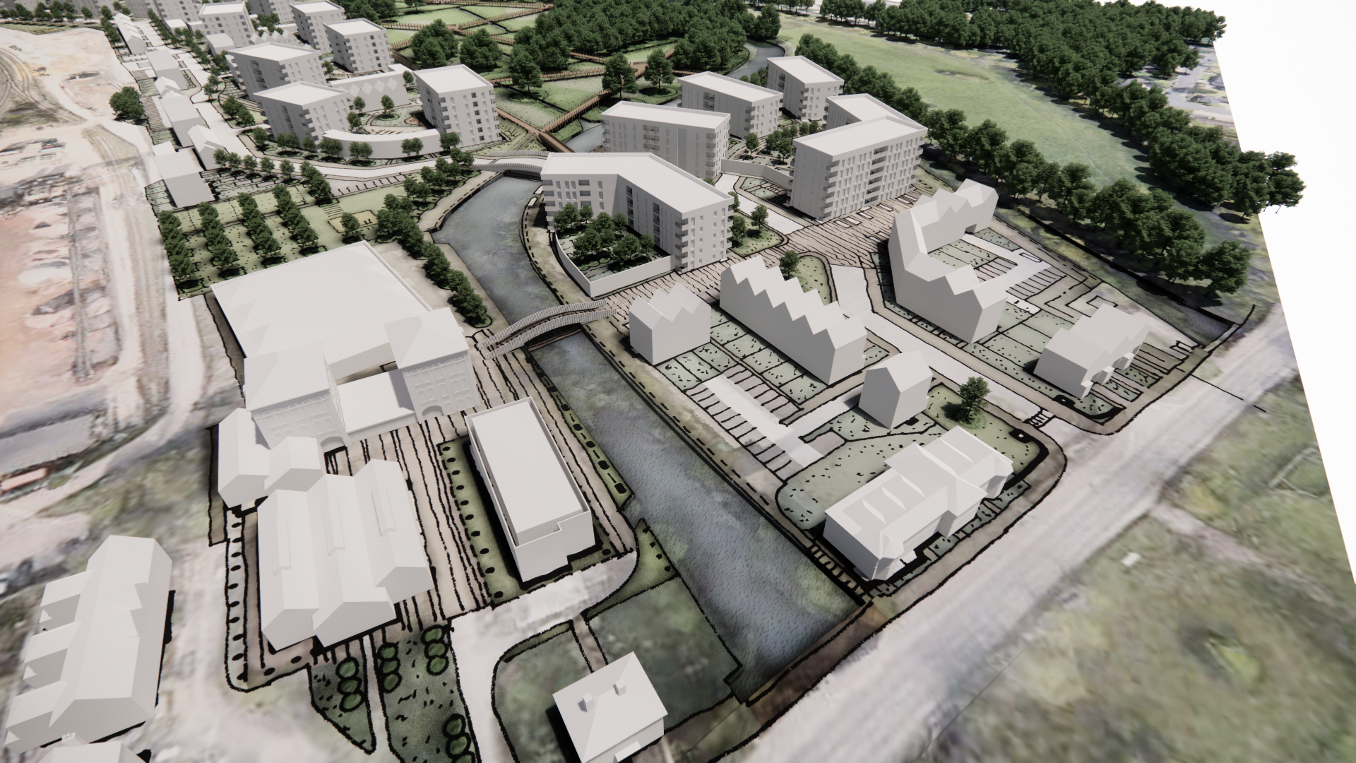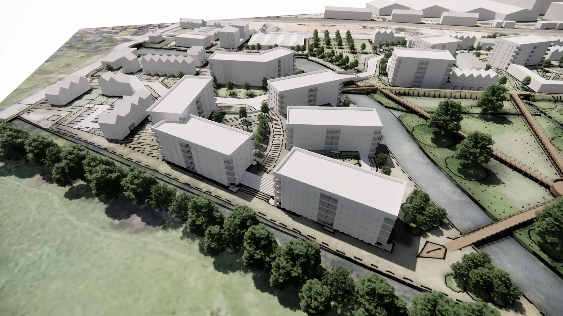 We developed a narrative for the new high density urban waterfront setting, adopting a sensitive environmental touch across the existing water meadows and providing an urban response to a new distinct village island setting. The concept seeks to combine disparate parts into one cohesive and bold masterplan, underpinned by a highly sustainable and environmental approach.