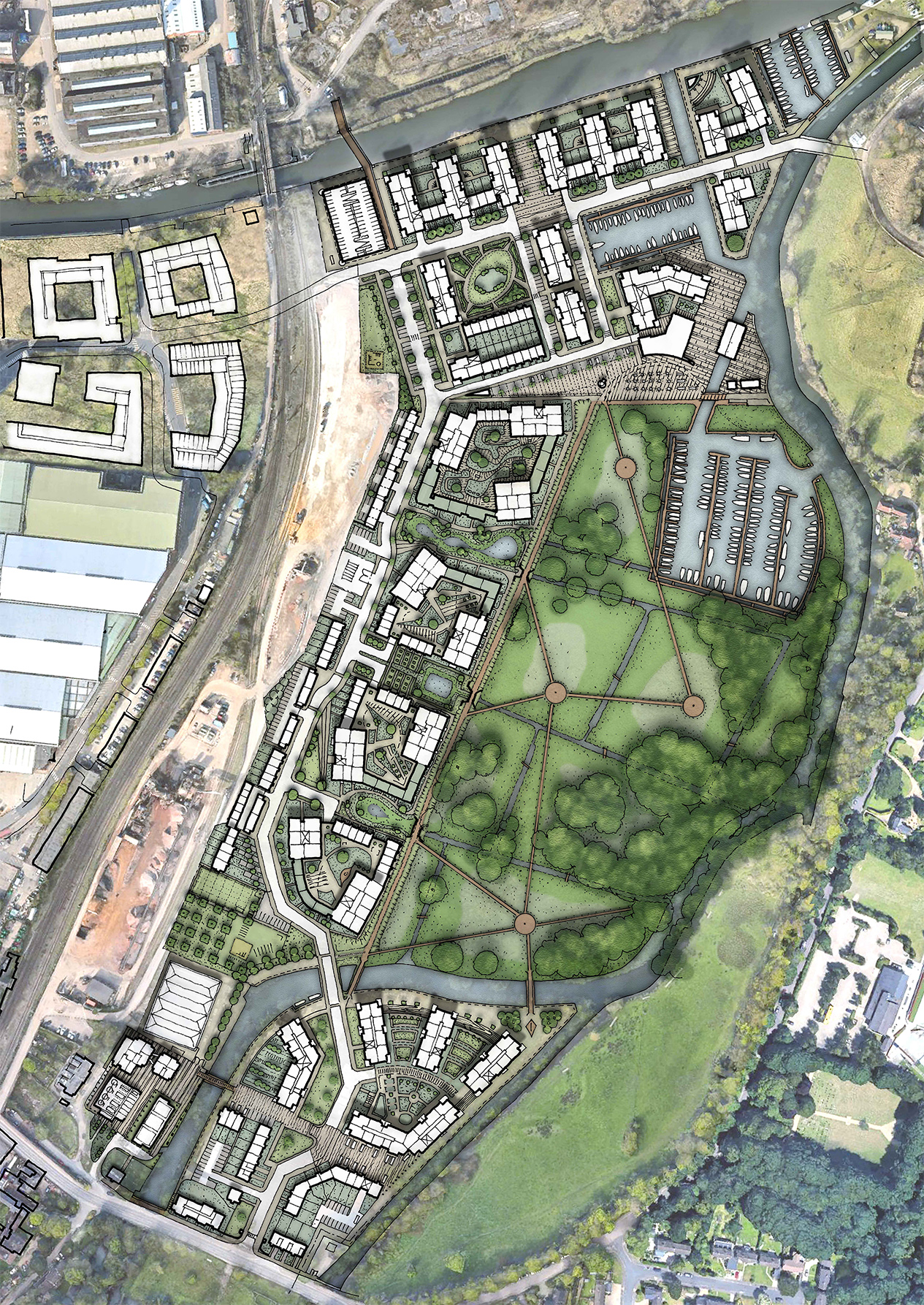 776 new apartments front the River Wensum, reinterpreting the footprint of former waterside timberyards. The masterplan alsointroduces new canals, serving new marinas and a south facing cultural-education centrepiece designed to respect an existing beehive brick kiln centrepiece.