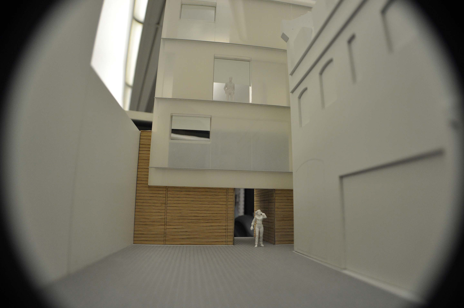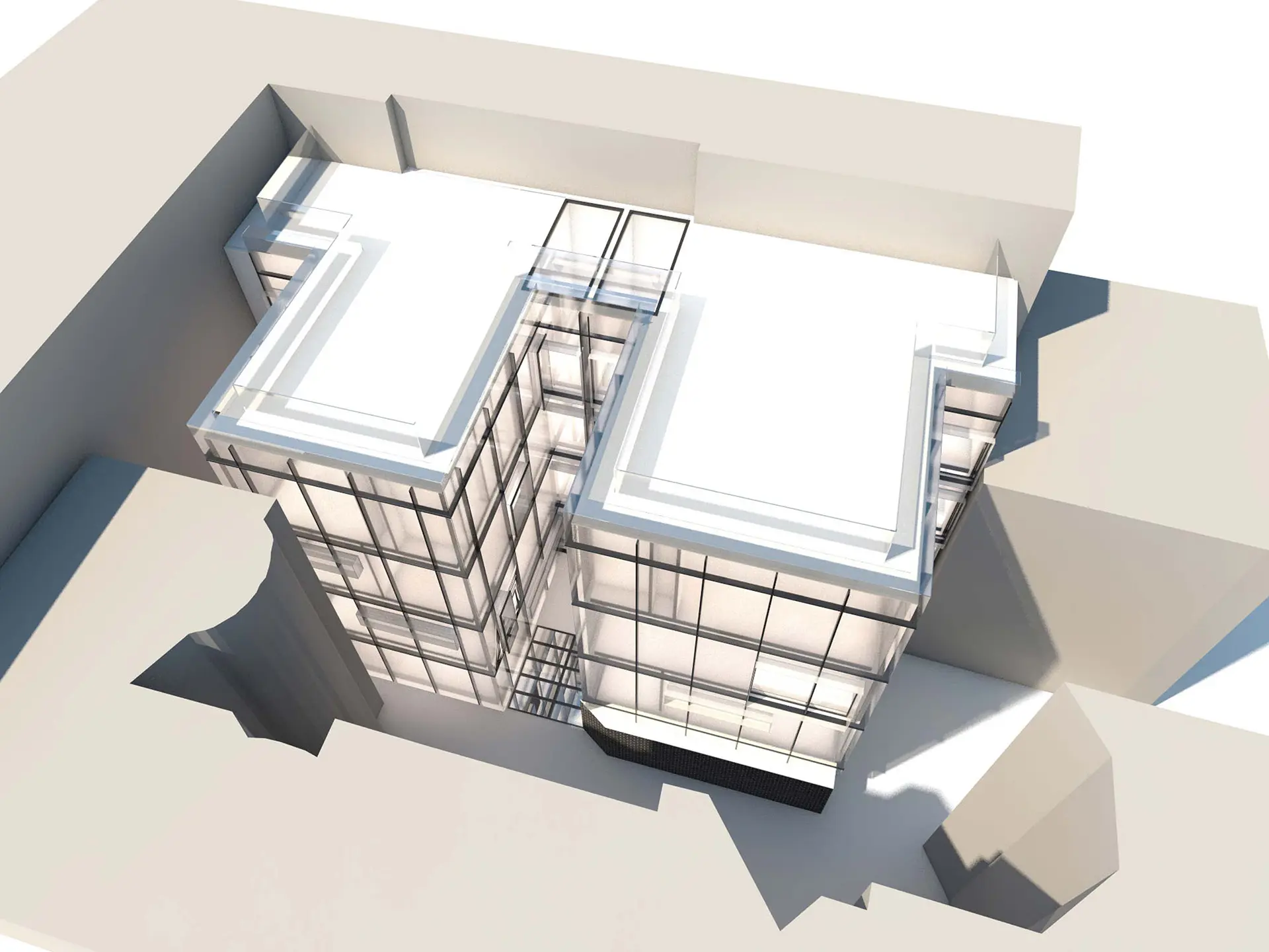Two translucent, glowing forms amongst the dense and complex urban context identify the buildings. This strikingly contemporary architectural response was inspired by the Modernist glass house – La Maison de Verre in Paris.