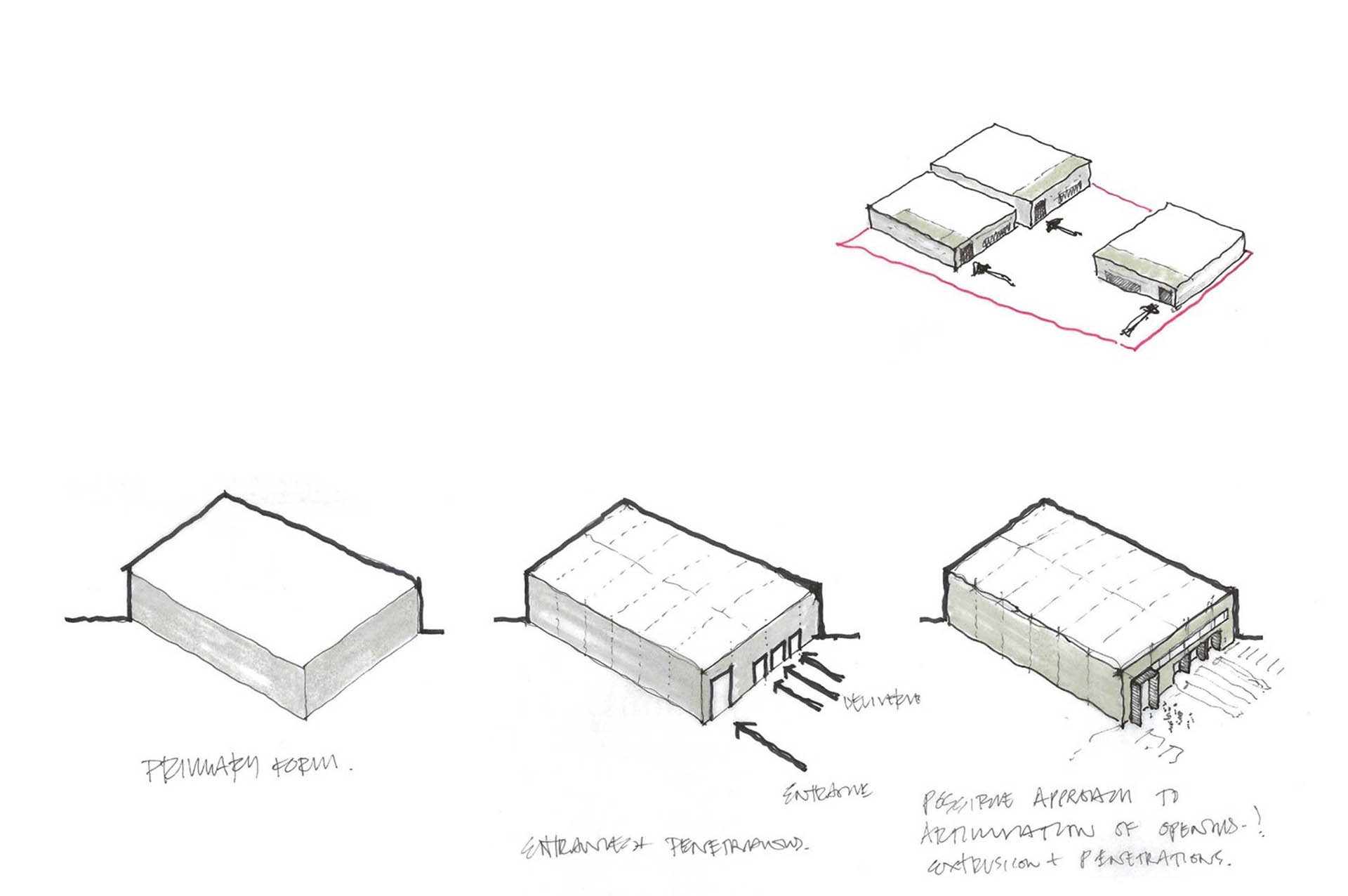 We conceived this as three cleanly detailed, buildings, separate yet part of the same development. We adopted a similar language for the buildings themselves which are flexible to grow and shrink to accommodate different warehouse sizes. We provided variation and identity by changing the colour of each building.