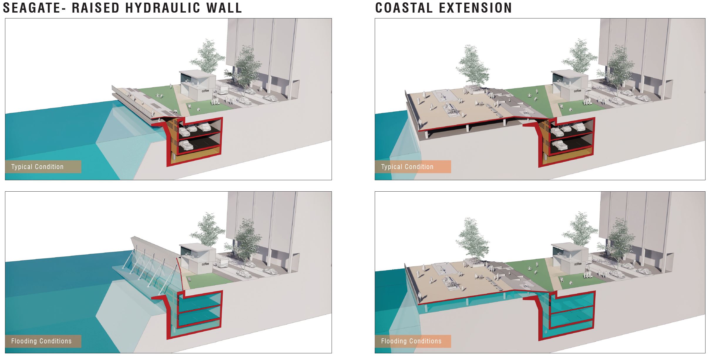 The tunnel operates in three modes: typical day-to-day, heavy rains and storm surges. FDCIP also proposes an automated, movable seawall to be located south of the Brooklyn Bridge. As sea levels rise, water from the river will fill a reaction chamber that will signal a hydraulic piston system to raise the promenade platform at the river’s edge into a vertical wall, blocking storm surge waves from reaching the adjacent areas and driving the water into the tunnel and back towards the river. In the northern portion of the site, both the tunnel and a coastal extension will be used for flood mitigation while also providing new land for the necessary open space for residents of the rapidly growing Two Bridges and the Lower East Side neighborhoods.