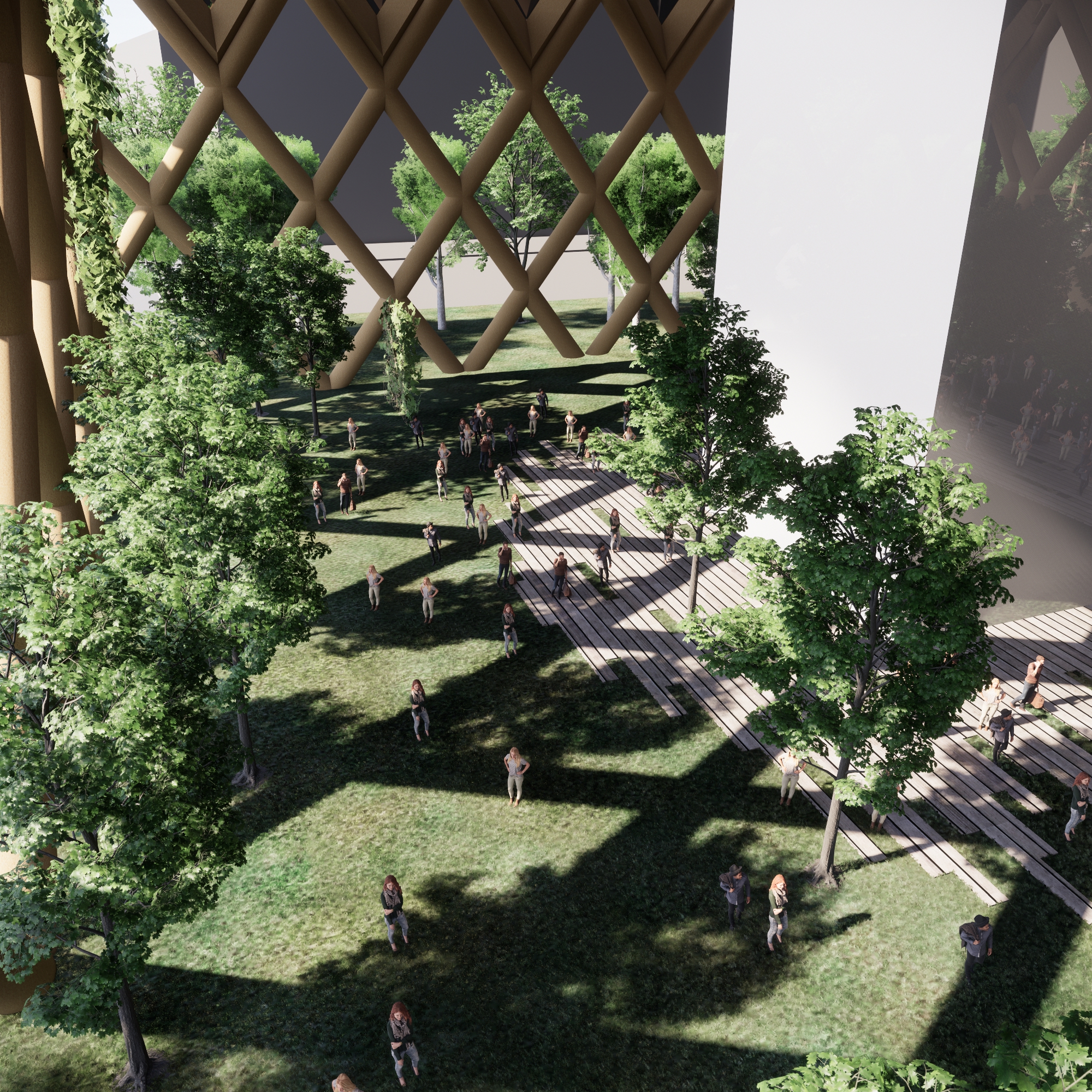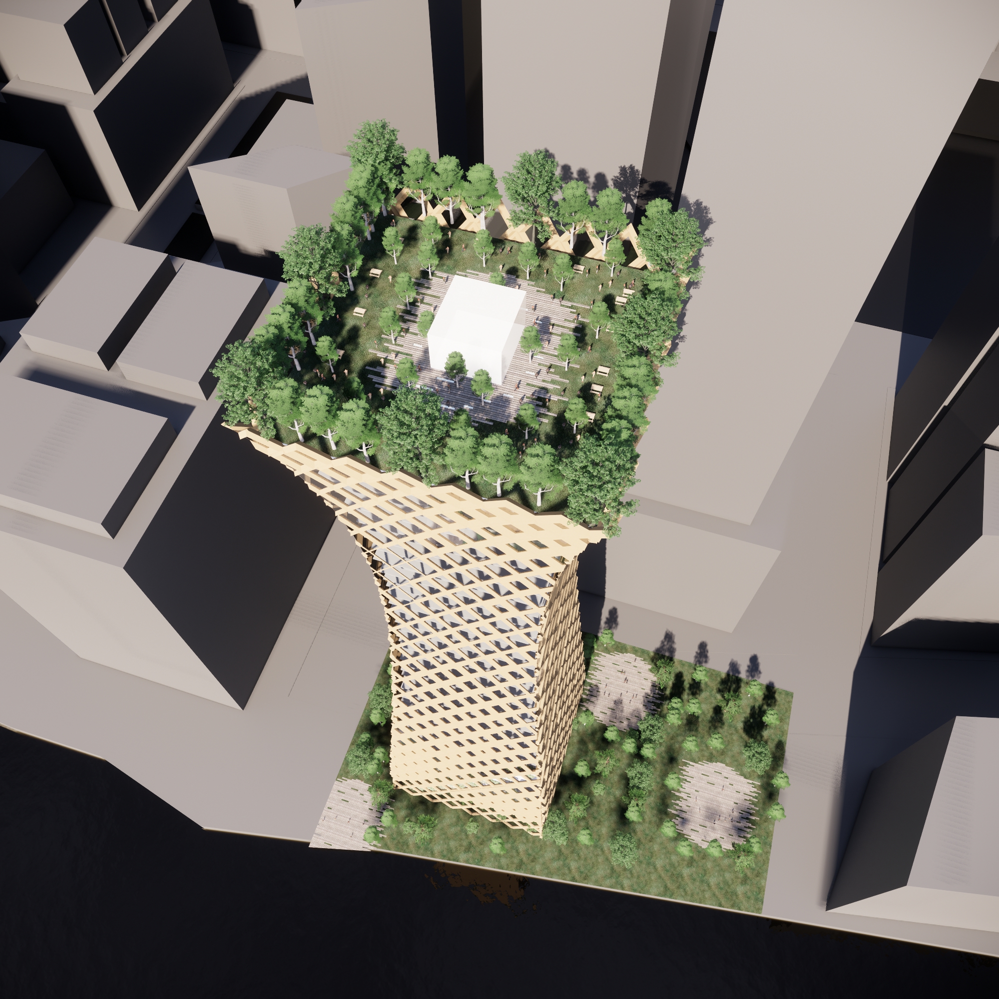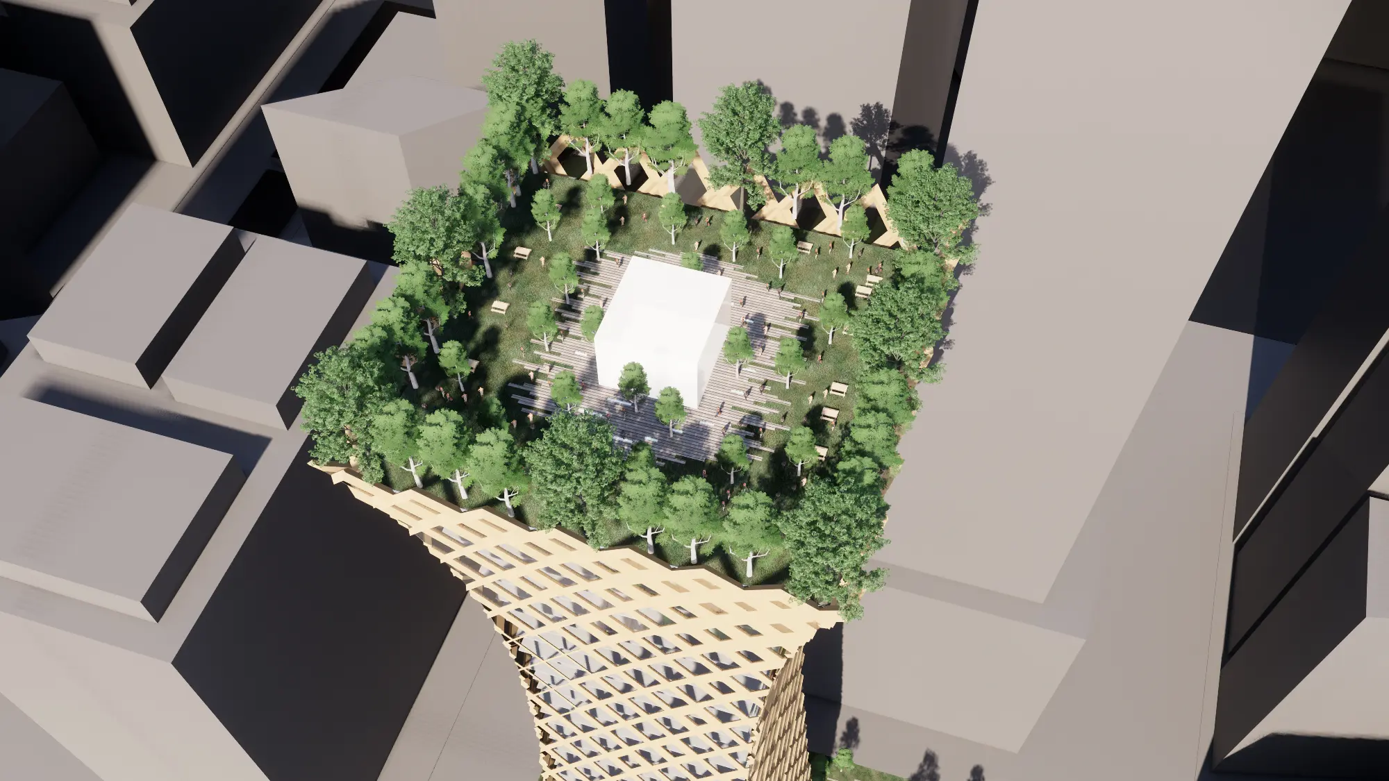 The mass timber tower incorporates LVL, CLT and Glulam in the fabric and