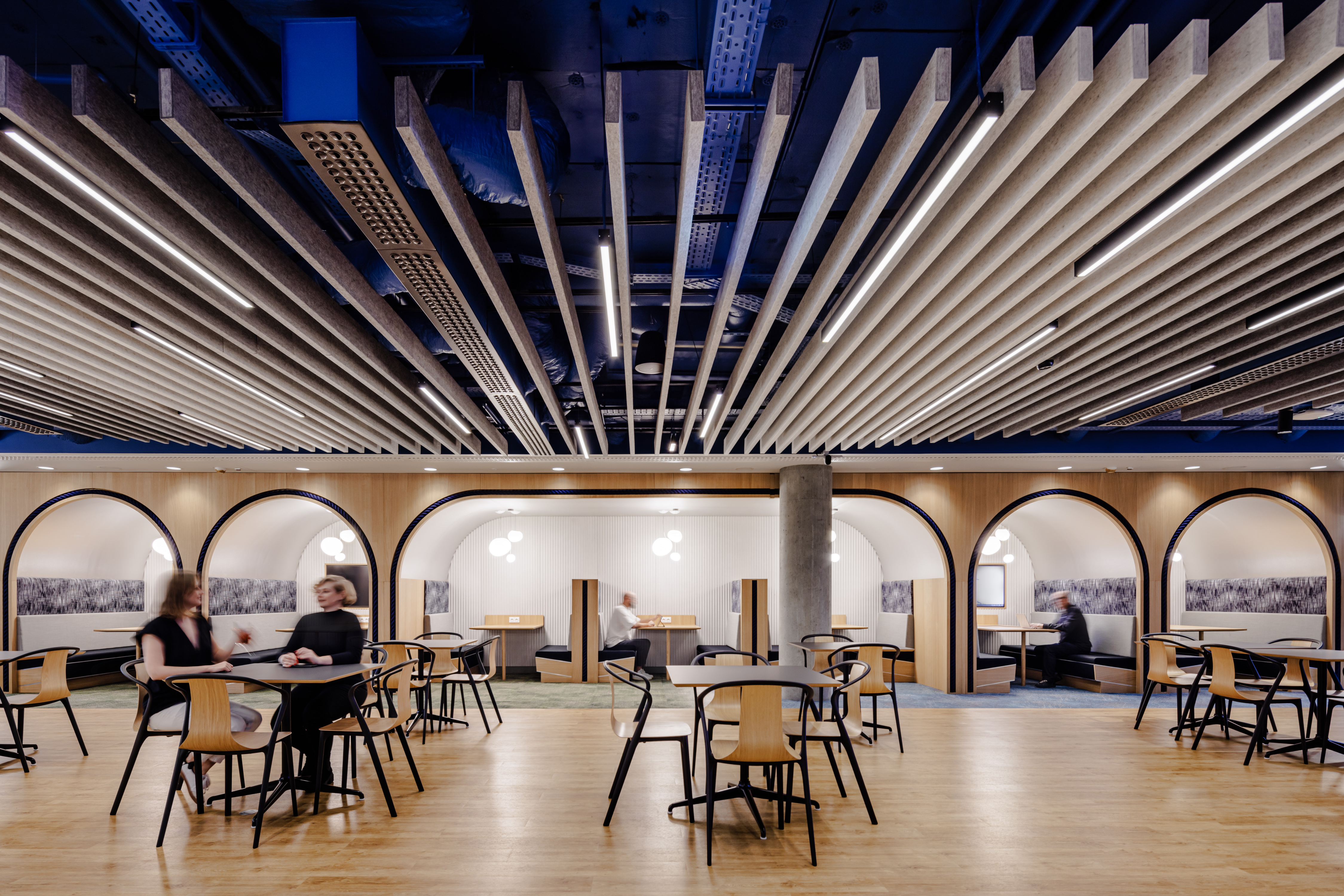 Alongside a variety of working environments, spaces are designed to enhance a sense of community. A multi-functional communal space set around island coffee points encourages informal collaboration, and is large enough for staff social events, presentations to over 100 people, and exhibitions of local photography.