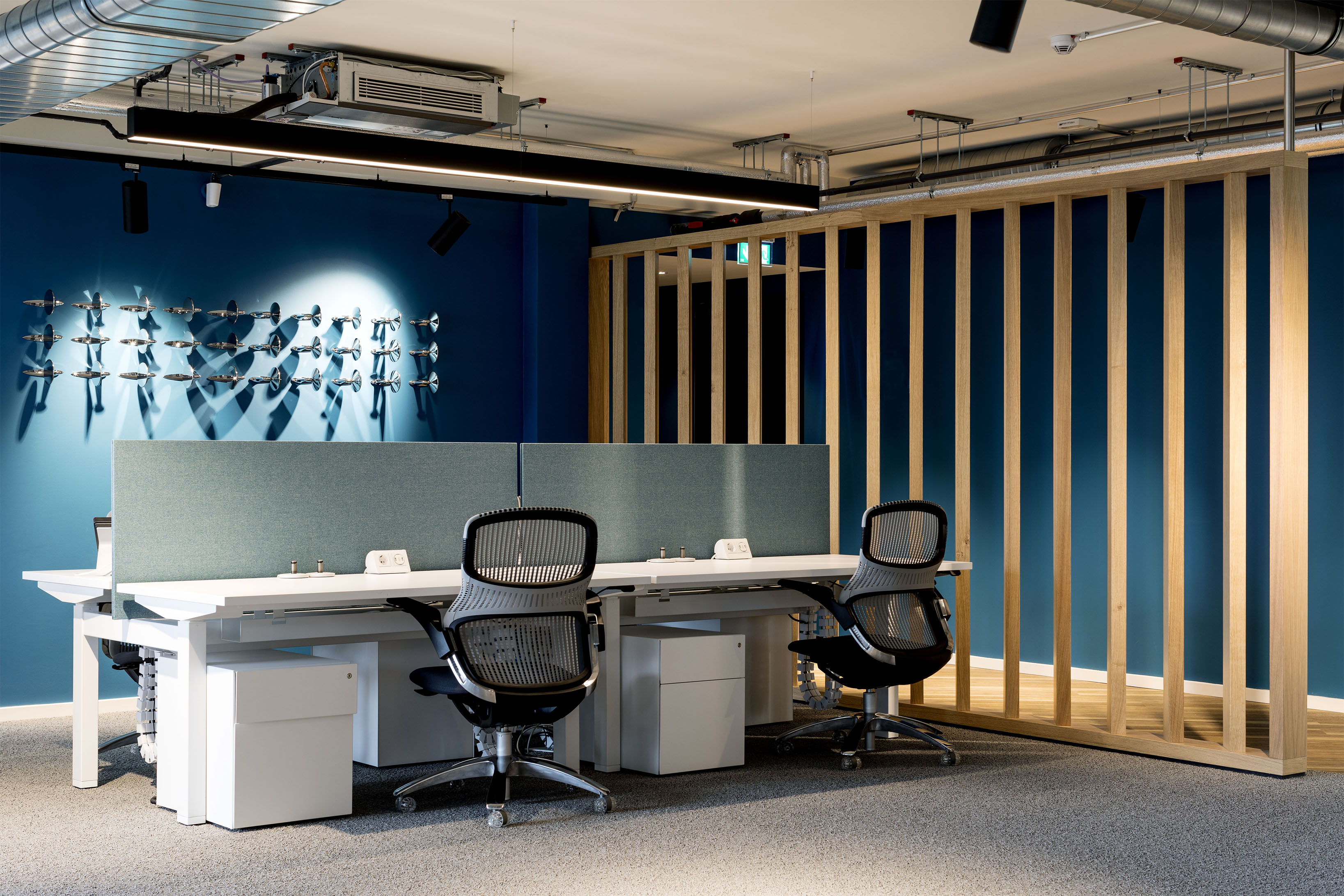 To achieve this we decided to express the emotional experience of car travel by introducing large-scale panoramic landscapes reminiscent of memorable road trips past. Knowledge of classic and technologically advanced cars is a key asset for the online car rental company. We illustrated this by incorporating full scale mechanical blue-prints of car engines in meeting rooms, together with icons of car components which have been dotted around the transparent glazed partitions.