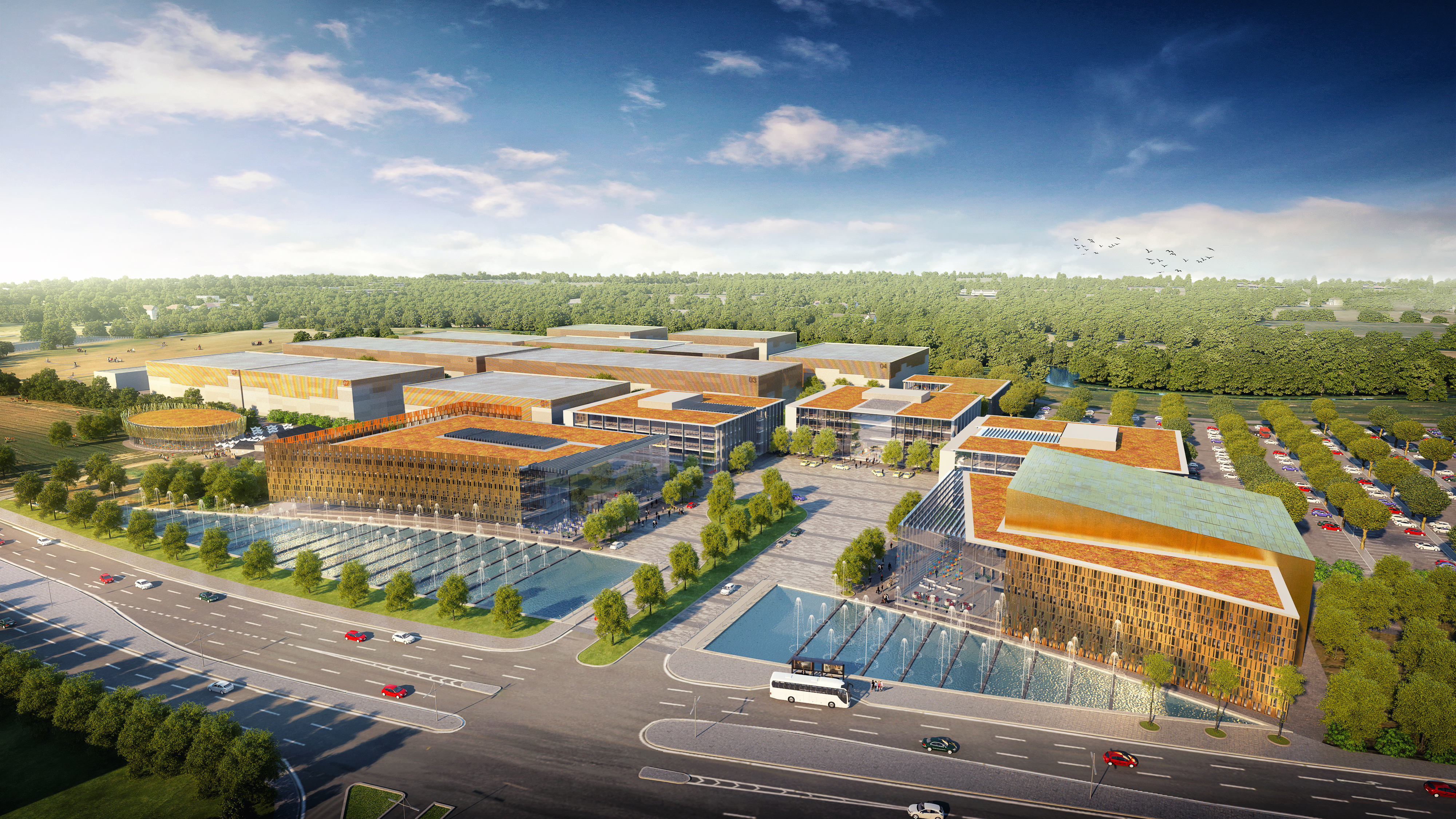 Working closely with the client, the masterplan evolved into a campus style layout including a major park to promote the health and wellbeing aspects of business and education lifestyle. The design includes workshop facilities, TV studios, 20 stages of various sizes, 275,000 sq ft office space and a 2,500 person auditorium connected to a music centre. A four-storey University building frames the entrance to the site.