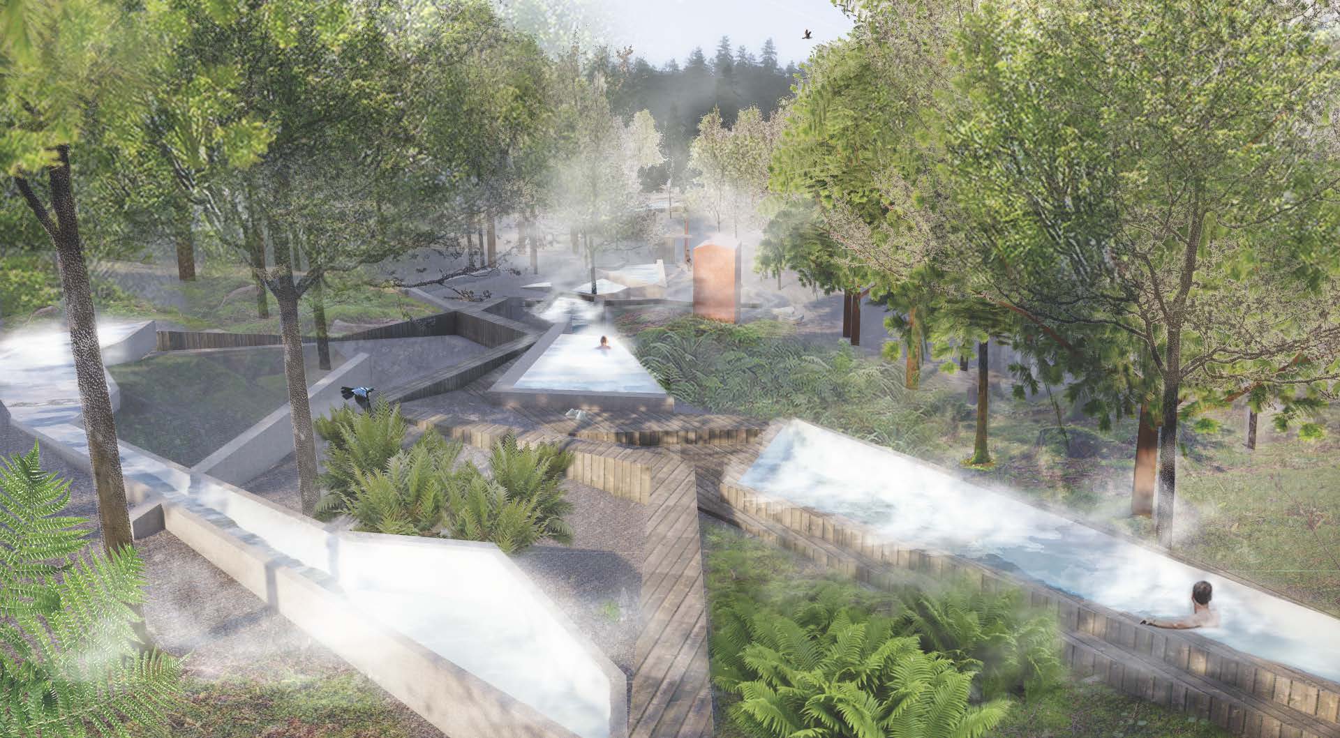 The first hotel – ‘The Karearea’, or Hawks nest – comprises of 20 rooms perched on a steep slope among the tree tops, and offers views of Lake Rotorua, Mokoia Island and over the Bay of Plenty. The concept is for an open timber frame with pre-fabricated bedroom pods inserted within.