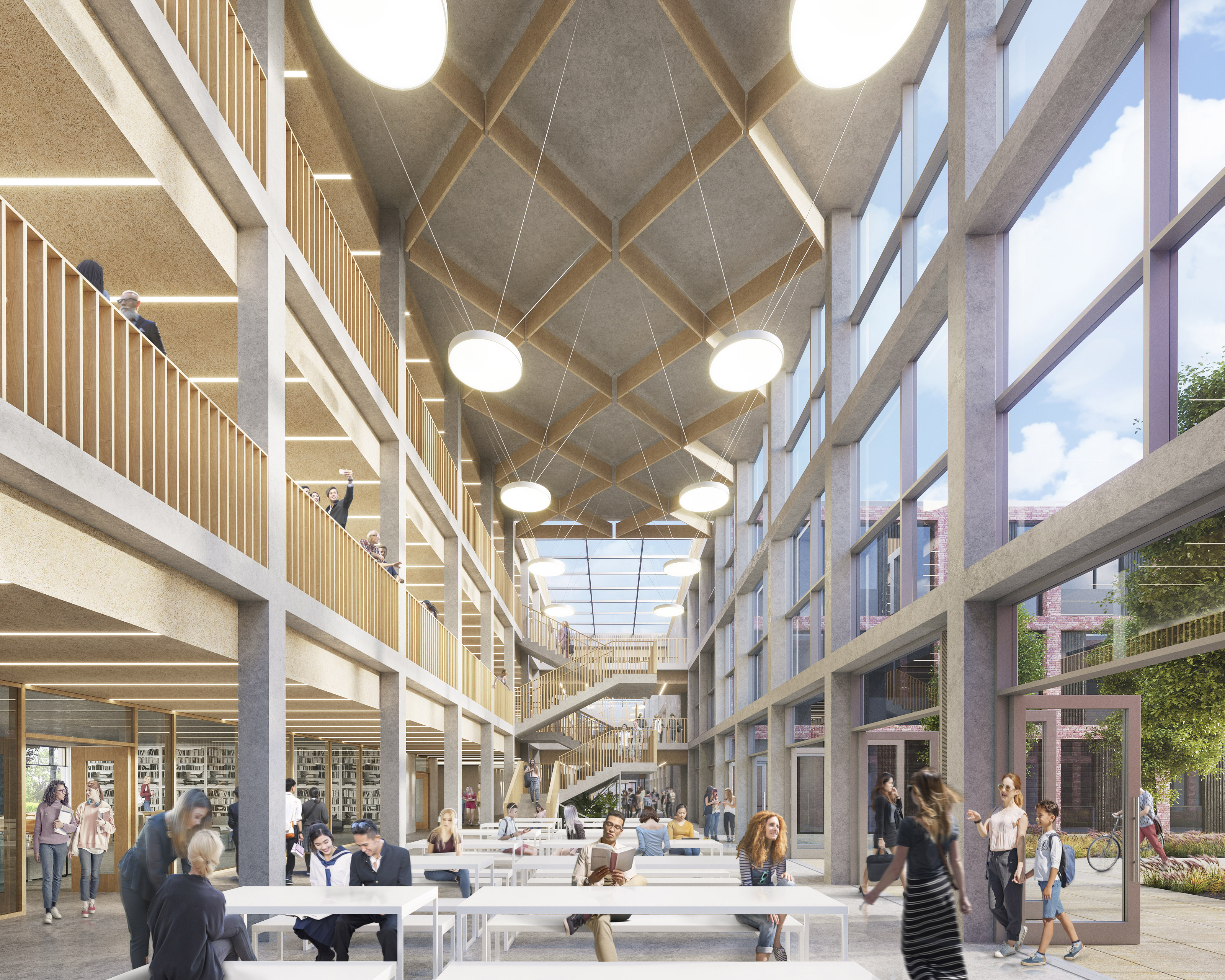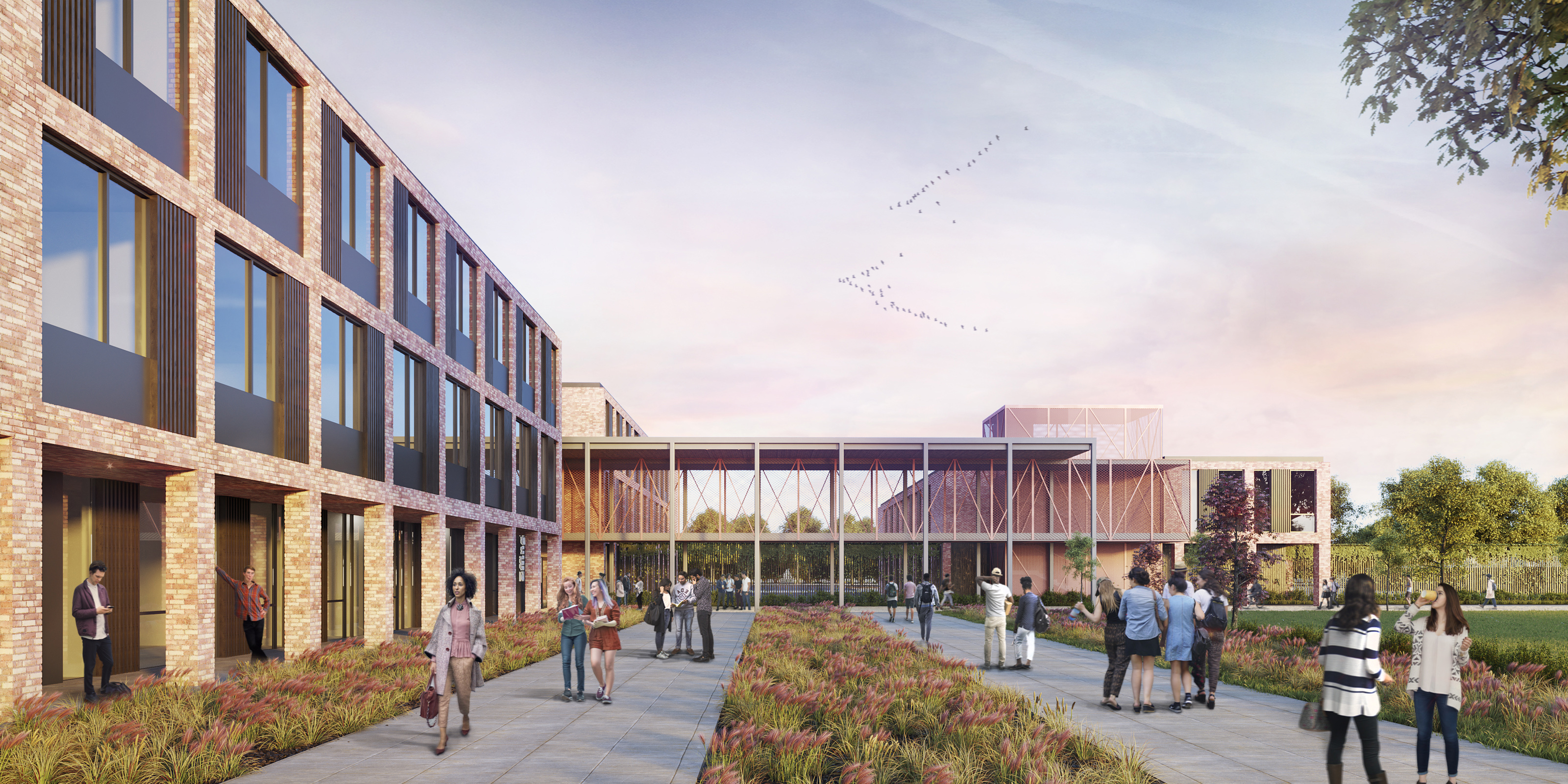 The design concept proposes an ‘education village’ grouped around a central promenade to create a series of buildings permeated by green landscape. The promenade sits at the core of the buildings, and will be the metaphorical and physical heart of the school. It is a space for learning, teaching, social interaction and enjoyment; allowing direct access to a series of external courtyards, each with a distinctive character and use.