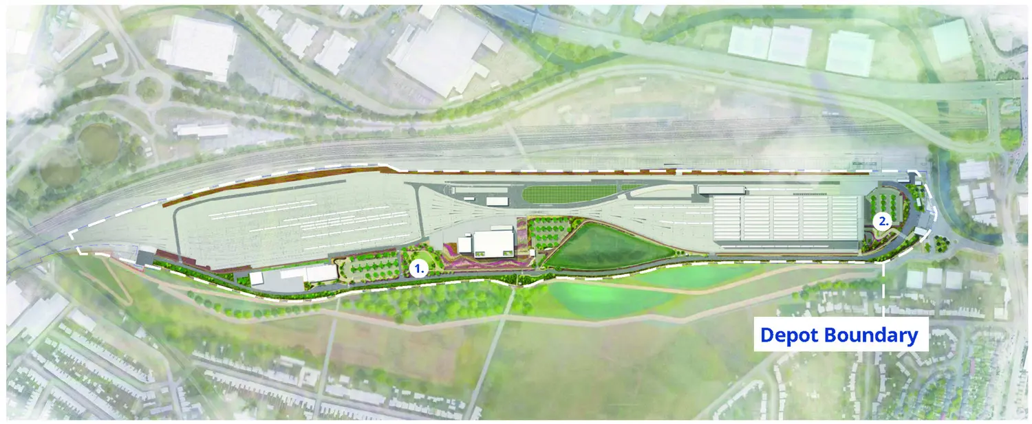 The depot site predominately comprises a train Maintenance Building, the NICC and Drivers & Cleaners Building and will be operational all year round. Other facilities include automated vehicle inspection & carriage wash, postal consolidation and delivery management, security, amenity and welfare, transformer and power supply and an on-site test track facility.