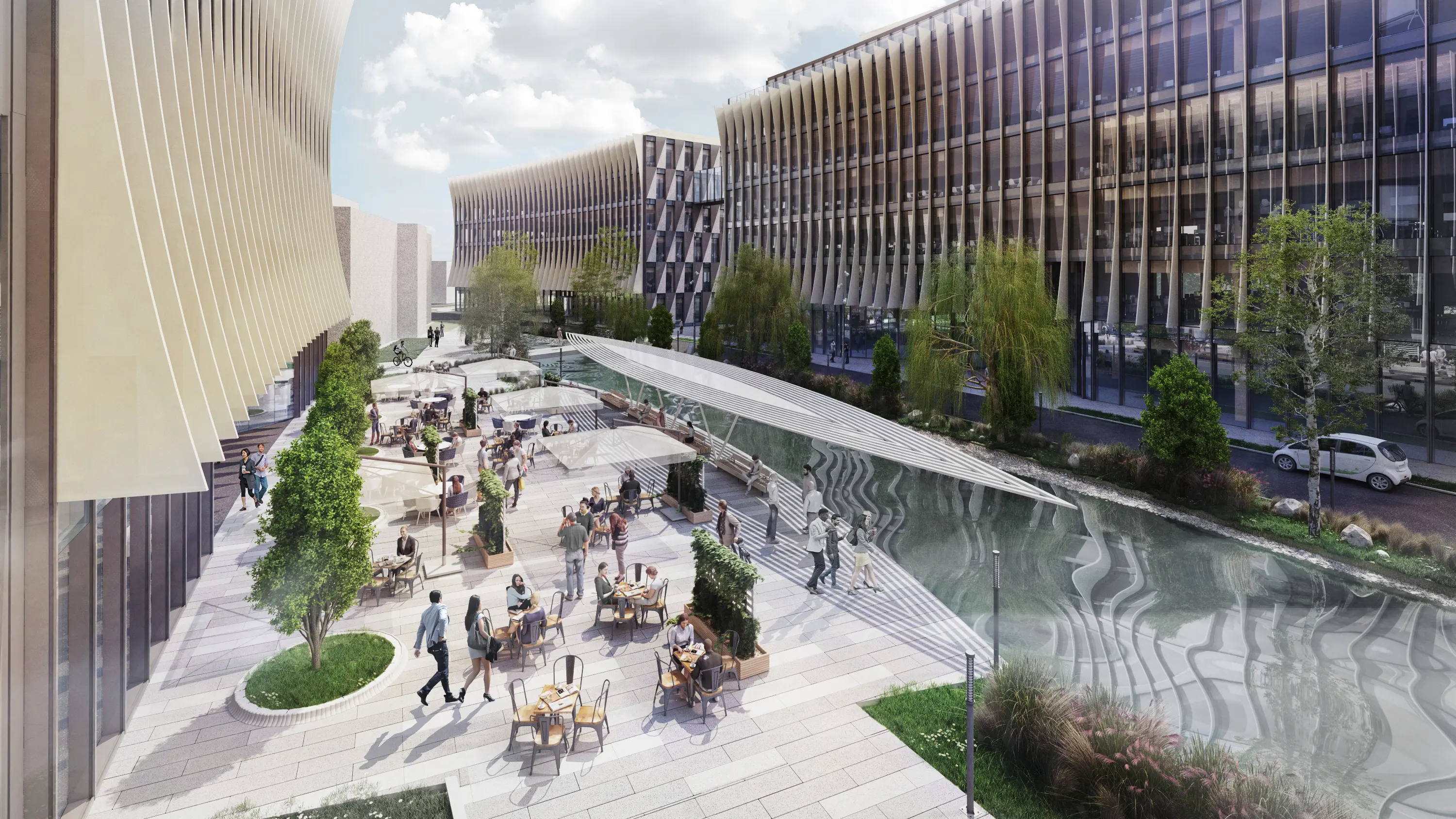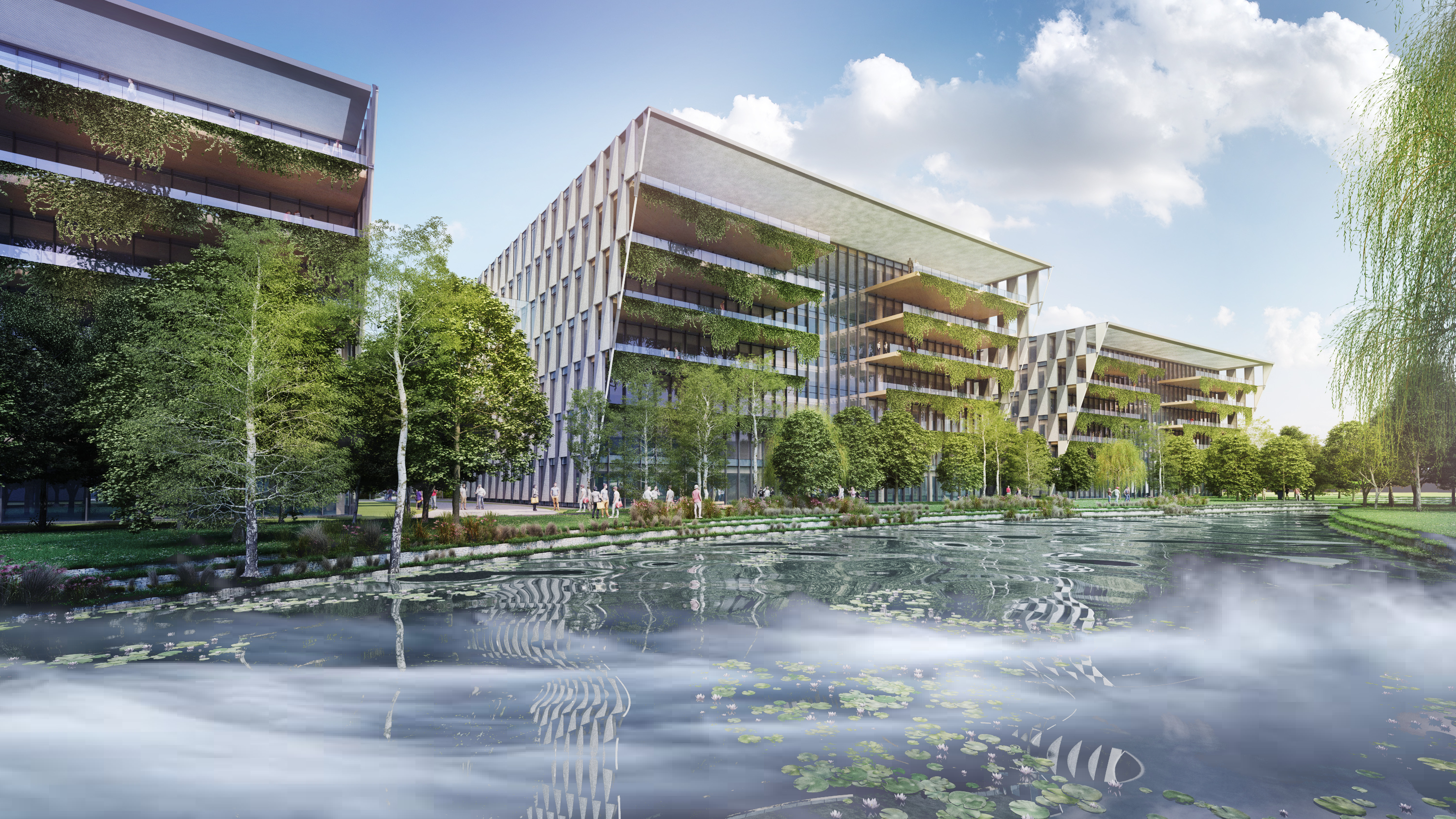 The site provides six buildings clustered around a central amenity garden and biodiverse water feature, a pedestrian biodiverse heart to the masterplan. To create a workplace that supports the future generation, the design is inherently flexible and technologically enabled to create a campus that is market leading targeting WELL Platinum Certification as well as BREEAM outstanding, LETI and LEED Platinum Certification.