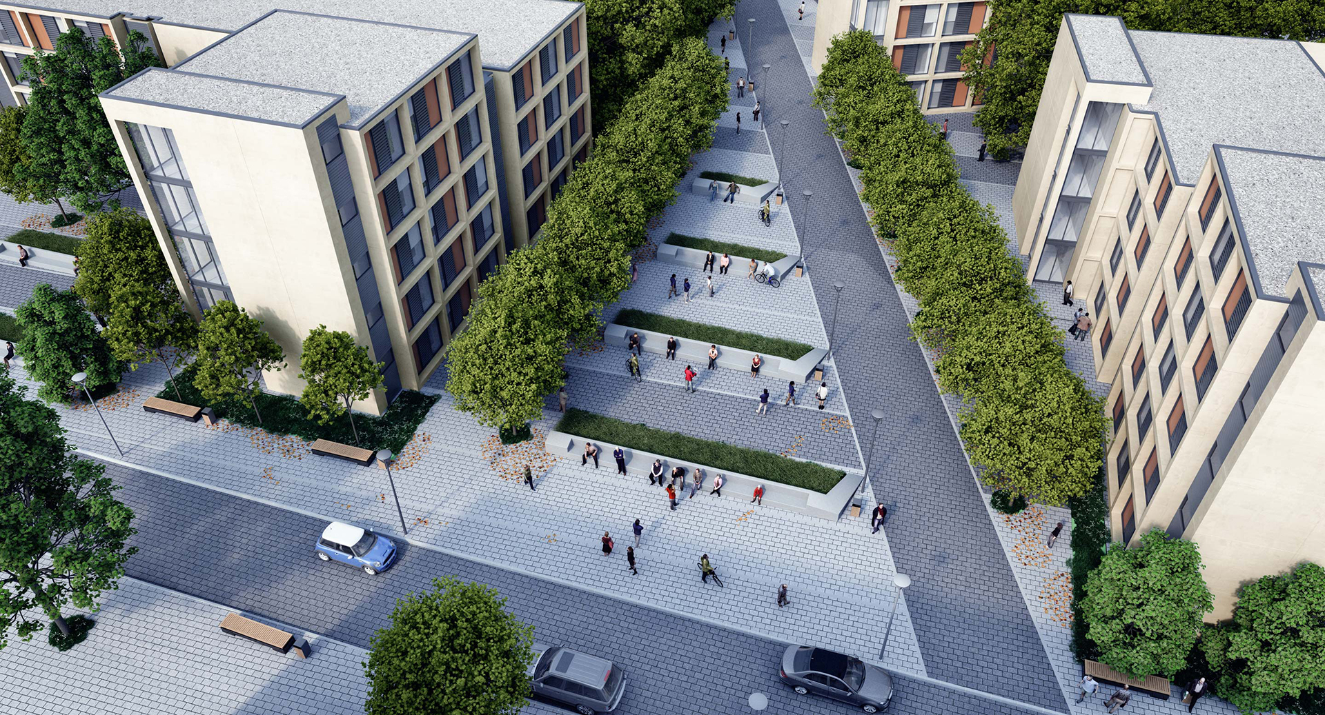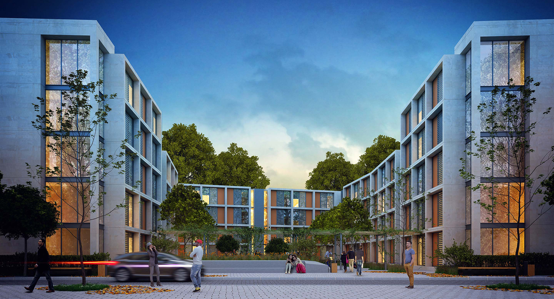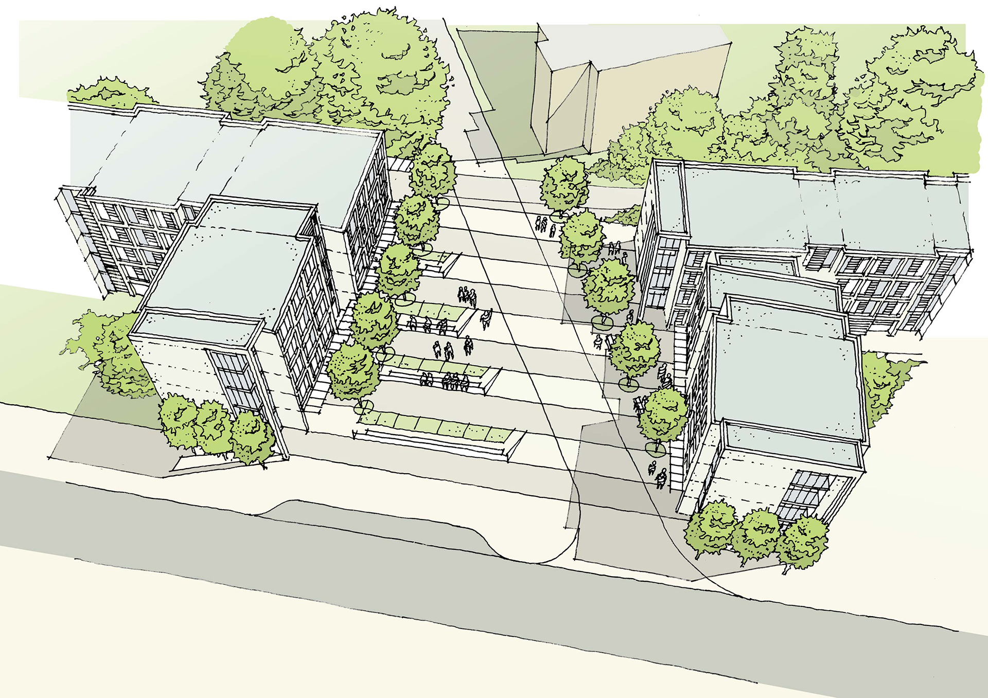 All of the building entrances are reached via this collegiate courtyard. We have designed each courtyard to provide privacy and separation from the street using a screening structure and gateway arrangement at the entrance.