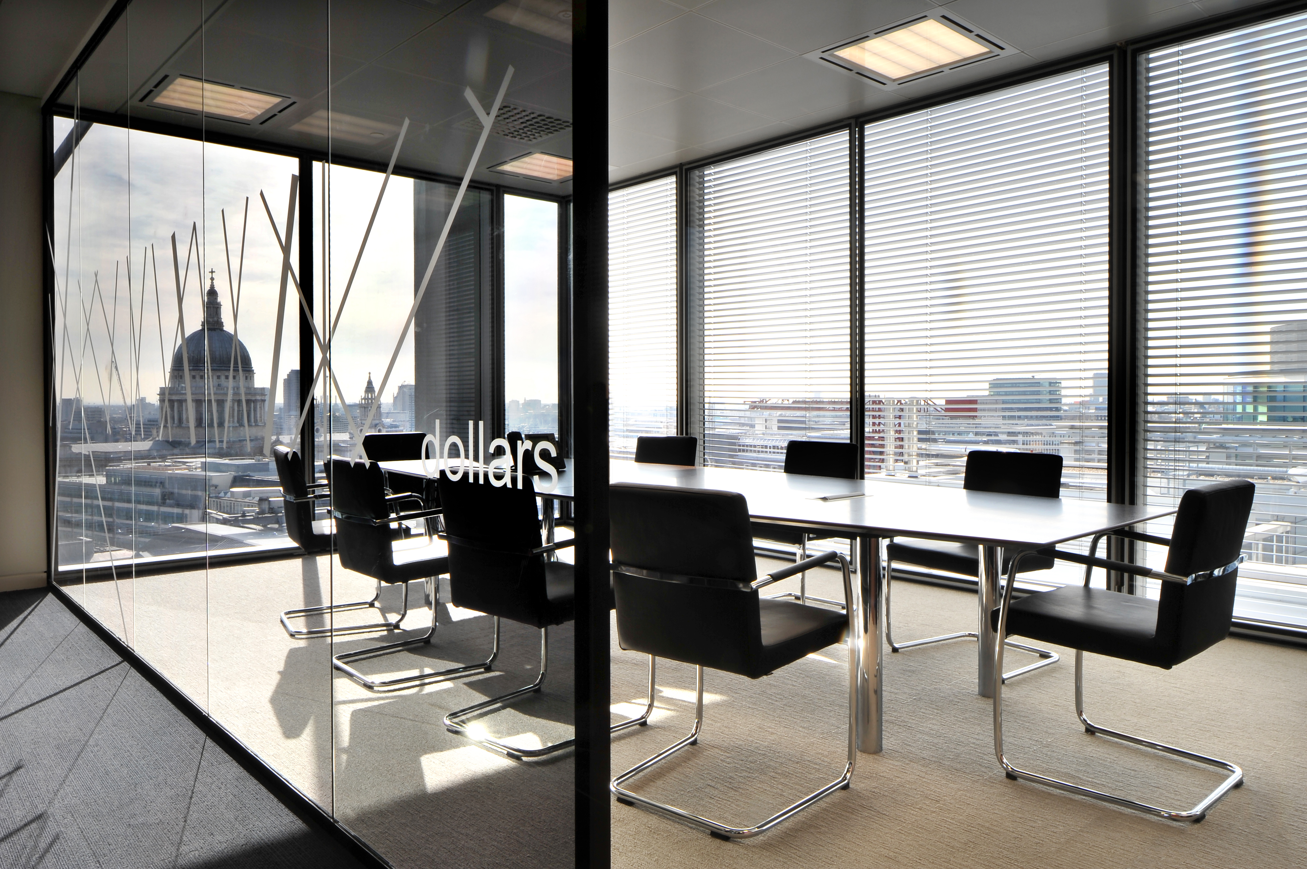 The stunning views over the City helped determine our design. The reception and 12 person boardroom is located adjacent to the lift lobby and provides impressive views over the Barbican. Not to detract from this view, our minimal design for the reception uses clean, strong lines and muted colours. An outside terrace on the trading floor increases break-out and entertainment space and provides an illuminated dining and lounge area in the evenings.