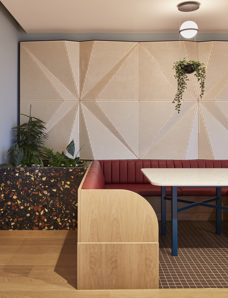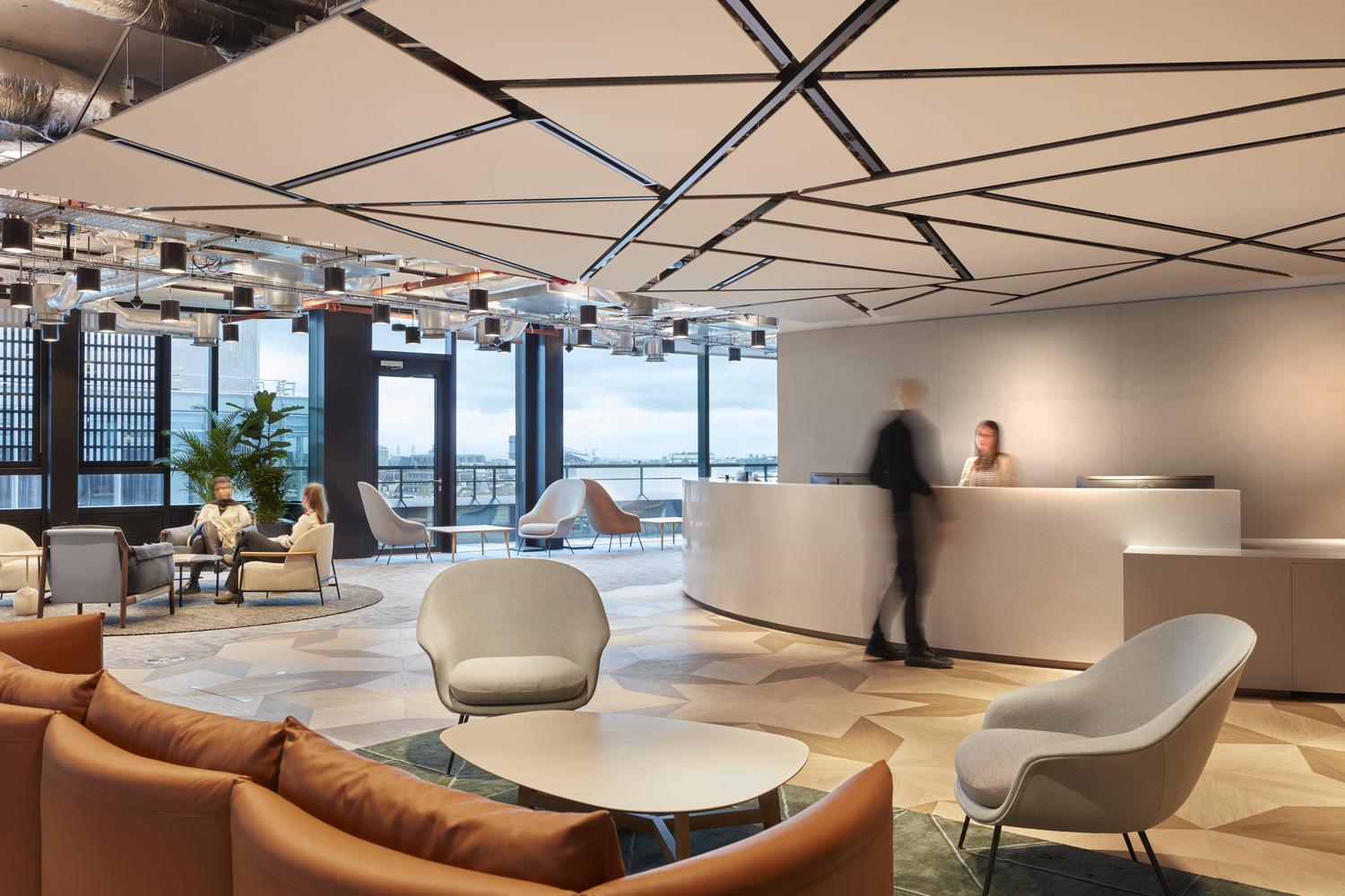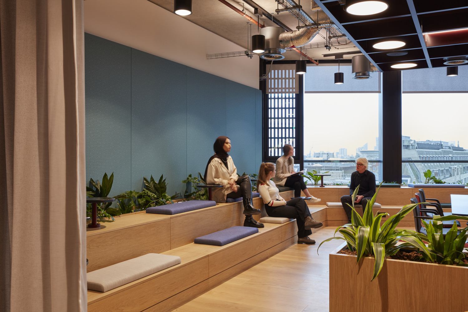 The LEED gold and BREEAM Excellent fit-out features spaces specifically designed for a neurodiverse workforce, including an orthogonal shaped space called the tuneable hub. It also comprises a range of spaces for focus work, collaboration, socialising and wellbeing, linked together vertically by a staircase which provides communication between all floors and features a central kinetic pendant light.