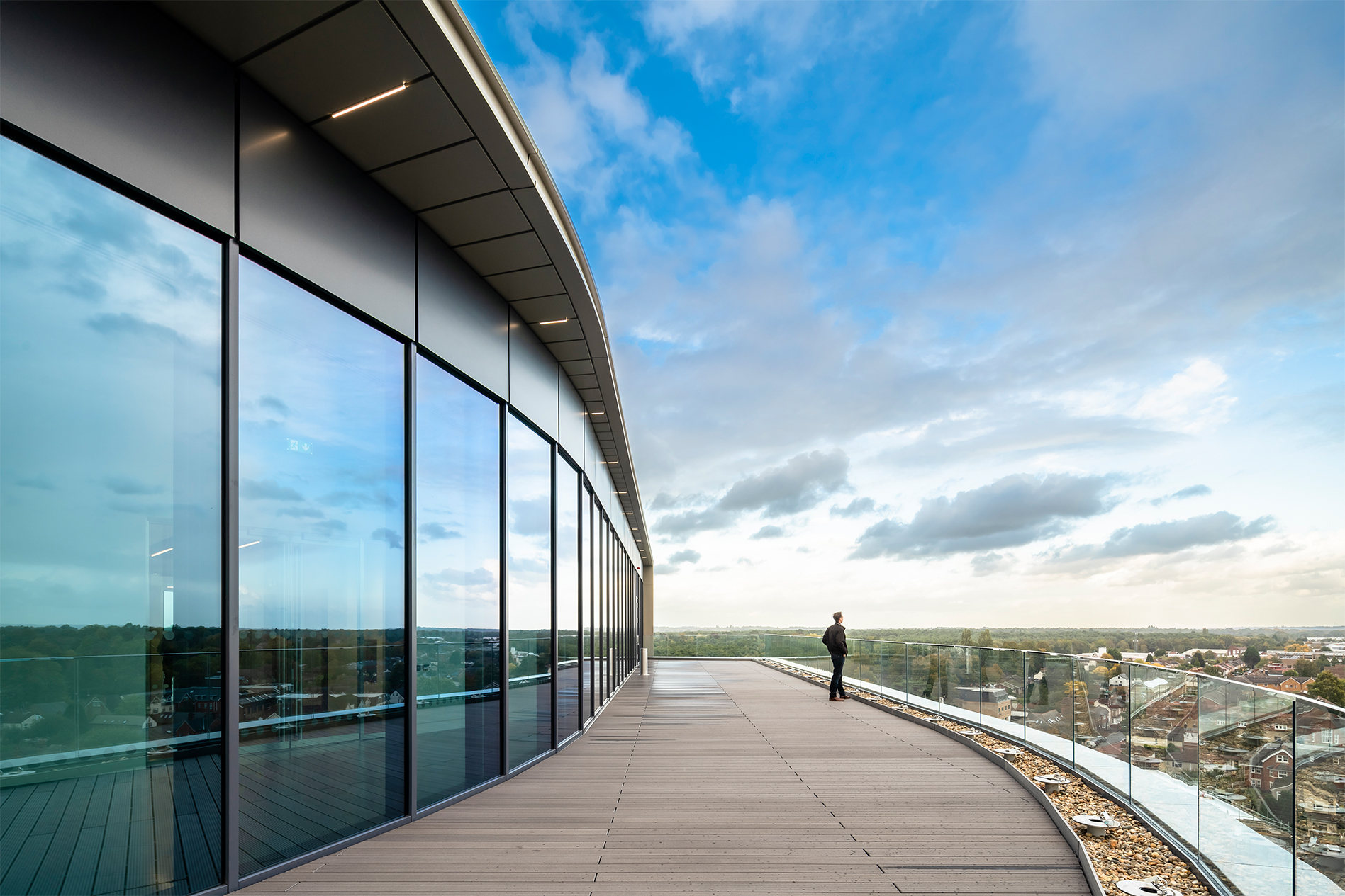 Our BREEAM ‘Excellent’ design has a commercial unit and main reception located at ground floor and a roof-top meeting suite and terrace overlooking Horsell common. An elegant, fully glazed façade maximises natural light throughout the building, providing impressive views of the surrounding landscape. Parking is provided at ground floor level and in a hidden basement.