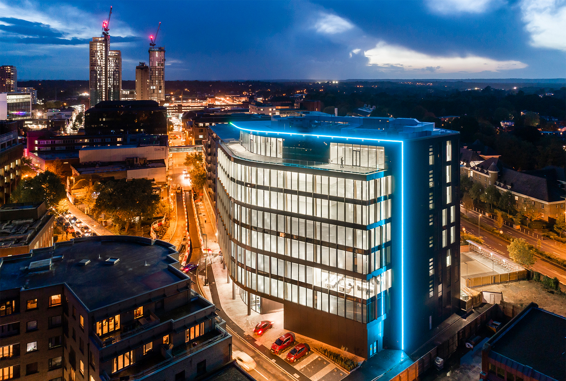 We were challenged to create a new speculative office space with efficient commercial floor plates and an elegant form. The floor plates needed to be highly sub-divisible to attract a variety of tenants. Our clients’ aspiration was to set the standard for further future contemporary schemes, to transform Woking town centre.
