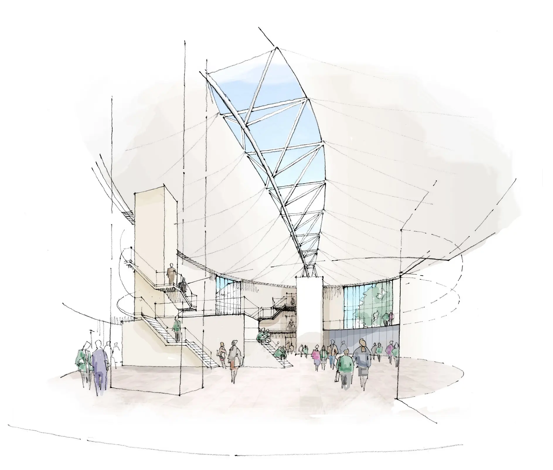 Our concept for this 1,650 place school with sixth form expresses the school’s house structure and takes inspiration from nature. The plan form is flower-like and each ‘petal’ is occupied by one of the School’s five houses. Each ‘petal’ features a full-height project based learning space surrounded by teaching accommodation.