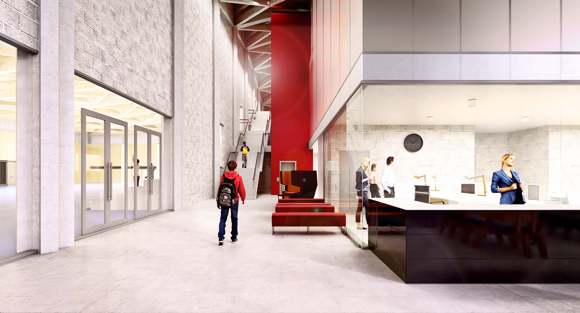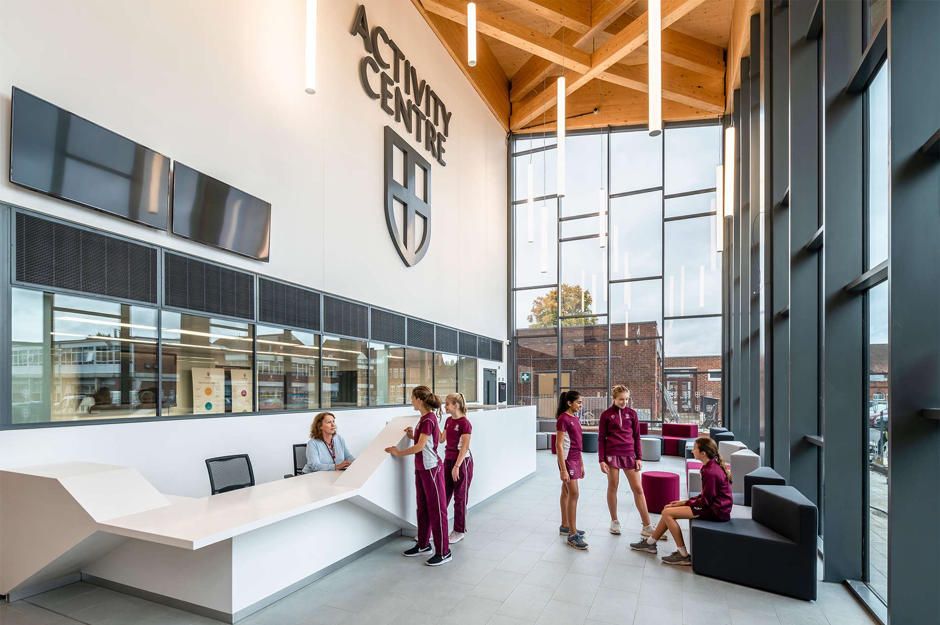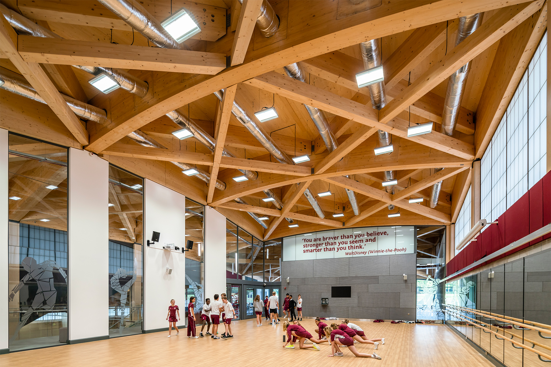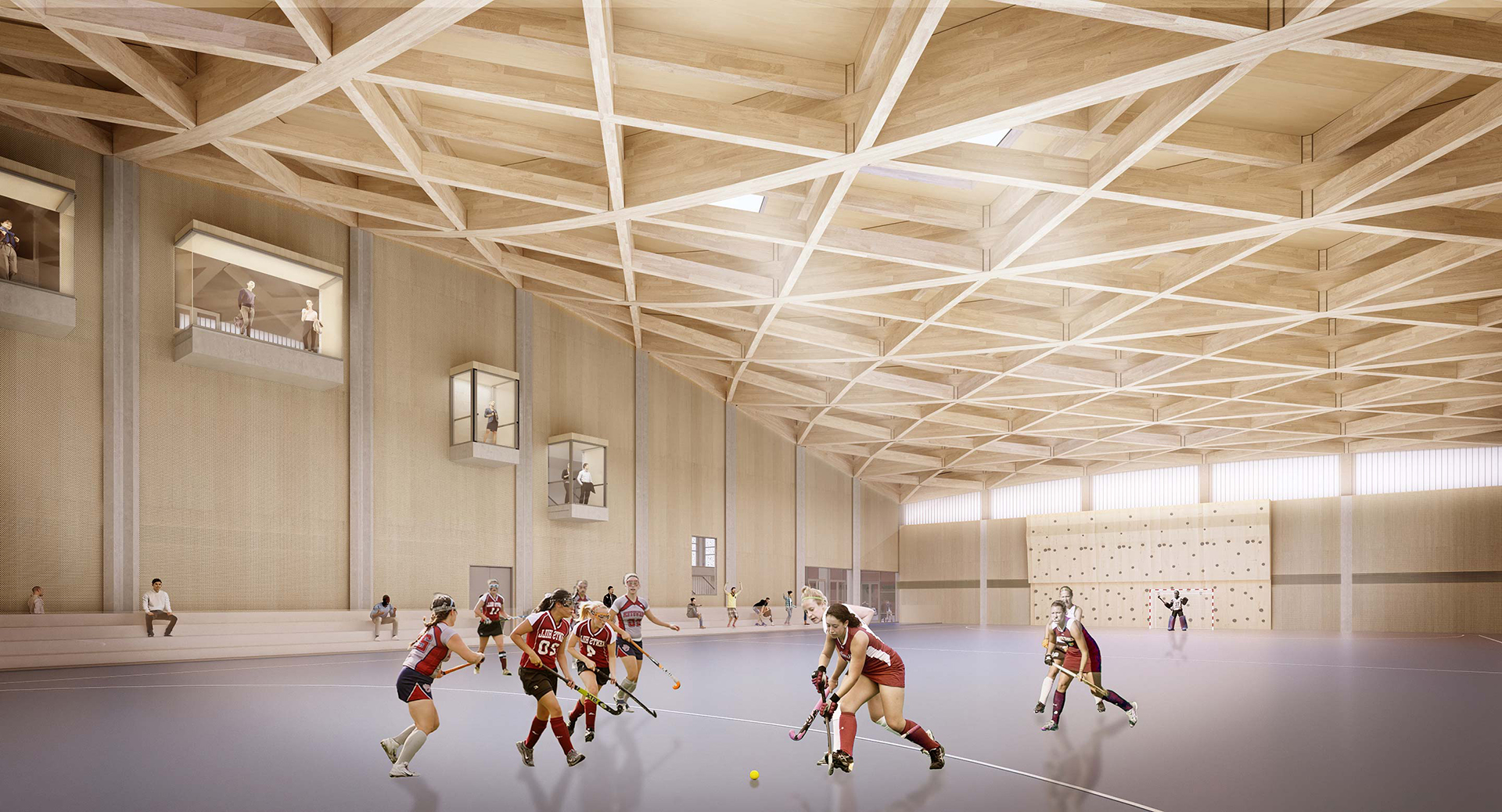 We designed a processional staircase that extends from the main entrance and connects the main campus with the athletics track some 8m above. We installed an innovative glass sports floor with LED line markings.