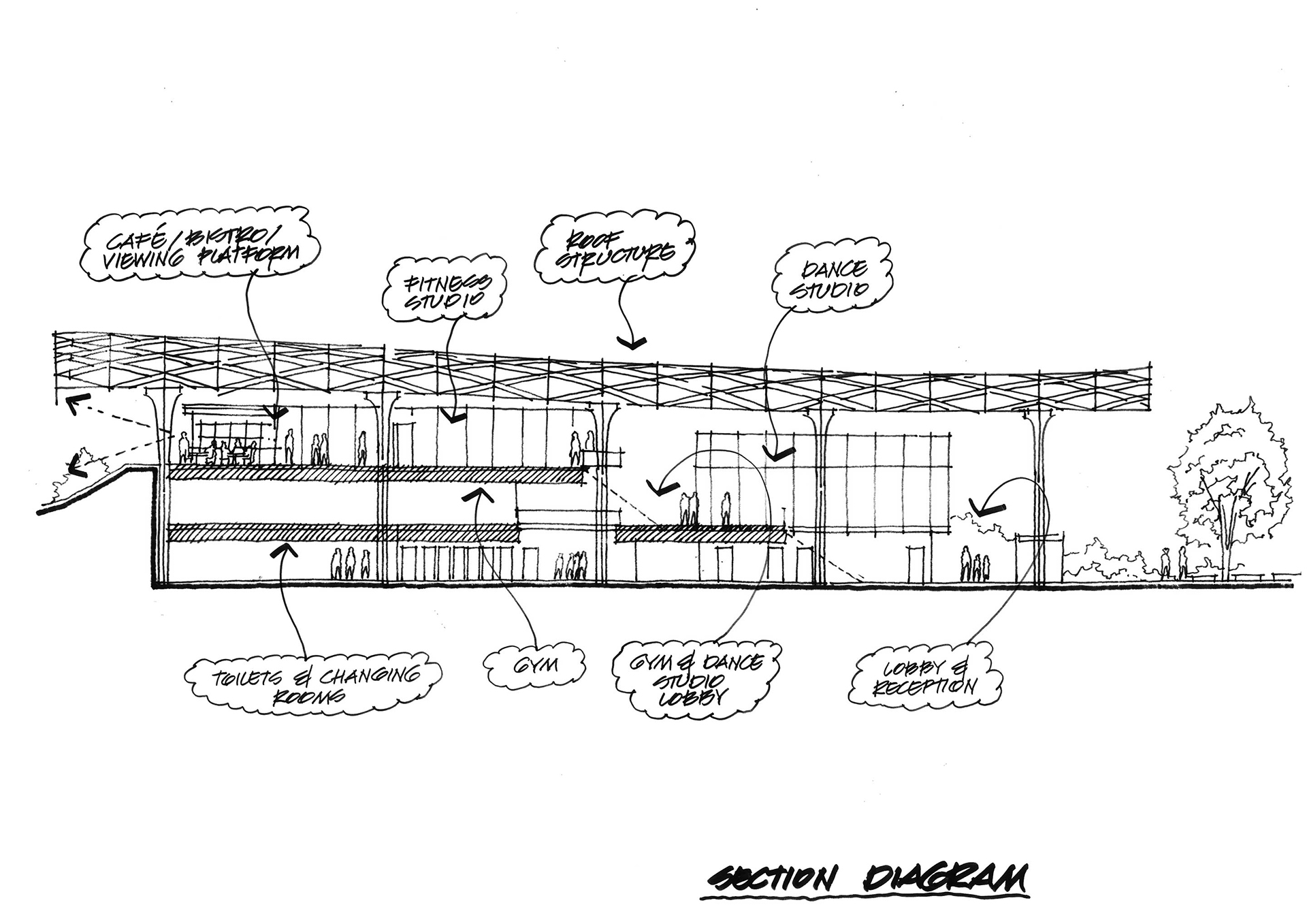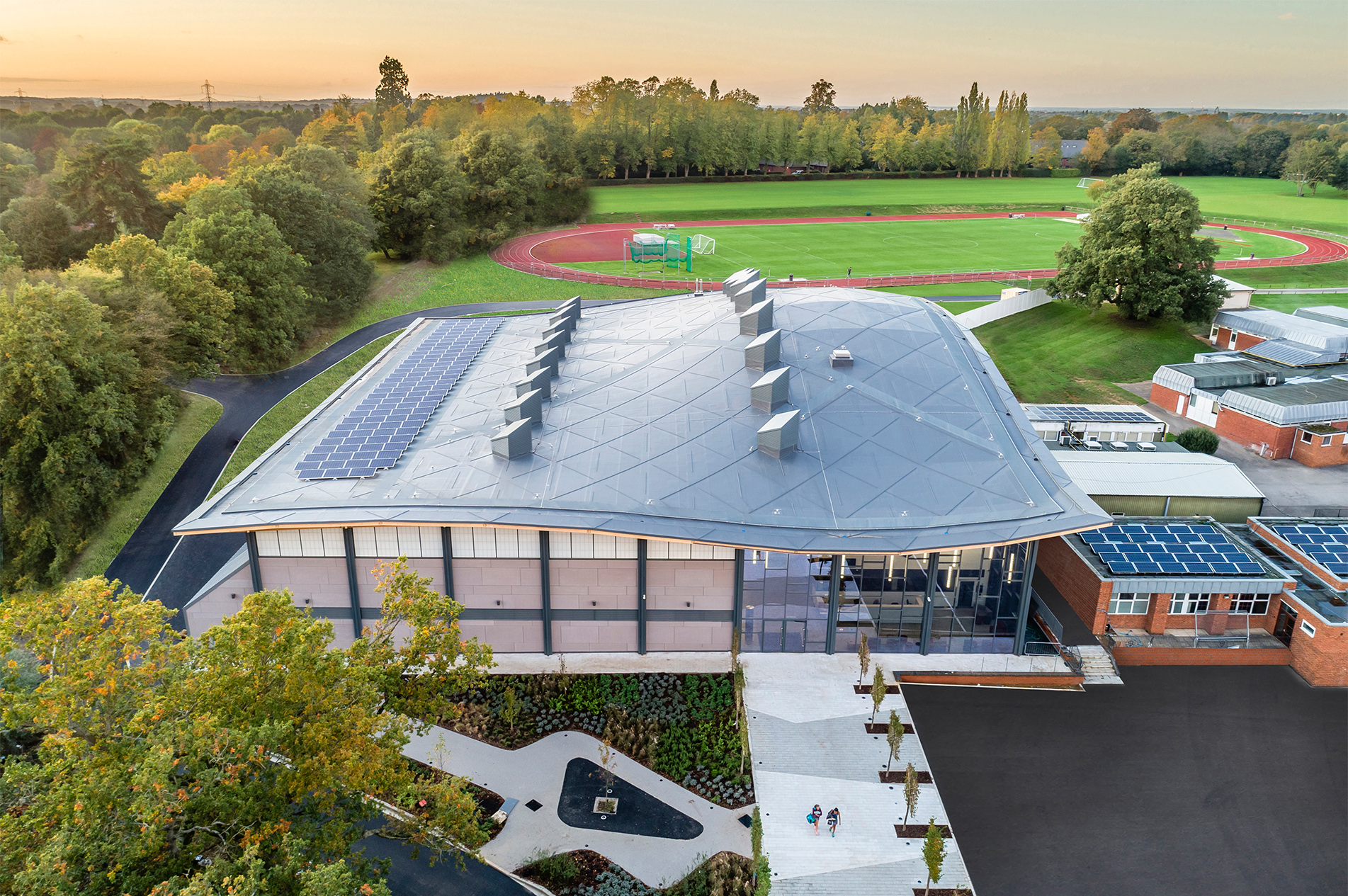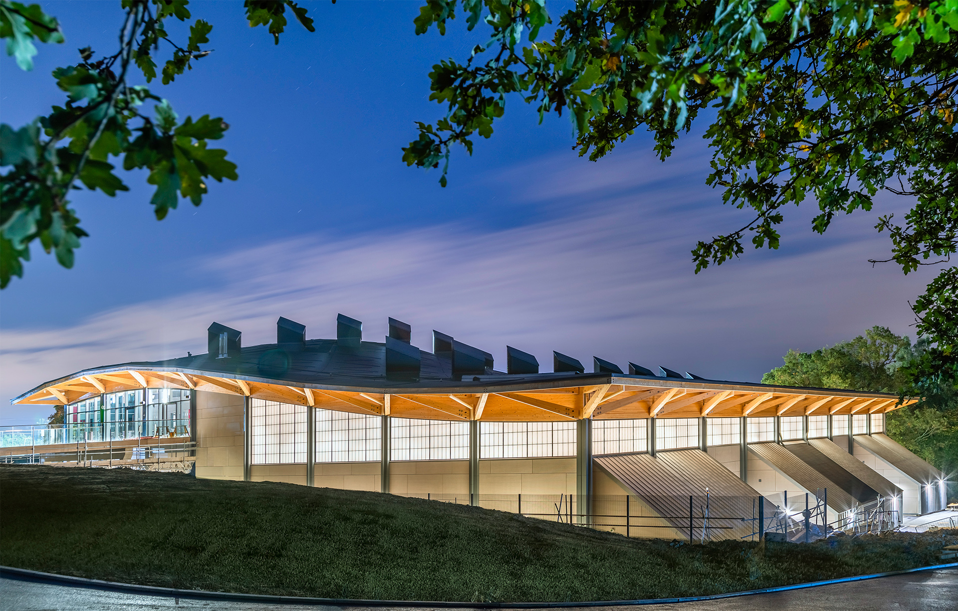 We wanted to create a feature green roof that was at one with its surroundings. Our response was an undulating roof with an exposed timber structure that defines the building form and the distinctive, cathedral-like spaces within. This visually striking element blends the large hall spaces into the landscape, pushes down to denote the main entrance and pulls up to frame views of the athletics track.