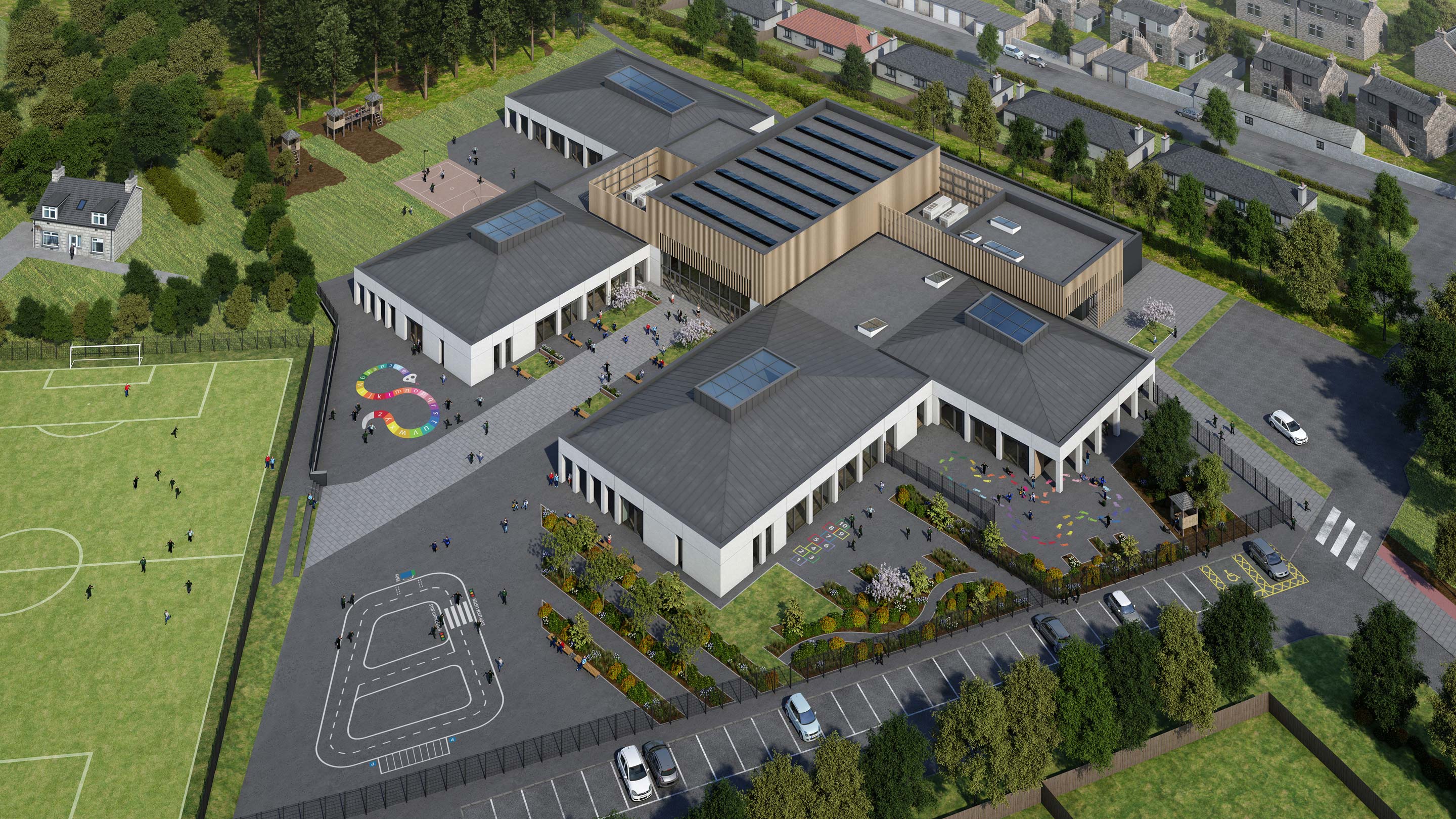 Our design is conceived around the strongest sustainable design principles. Comprising four teaching pavilions arranged around a core of community and assembly spaces. The teaching pavilions are clad in white concrete and each has a zinc-clad, hipped roof with lantern to illuminate the double-height flexible learning space at the heart of each classroom cluster. The core community and assembly spaces have flat roofs and timber cladding.