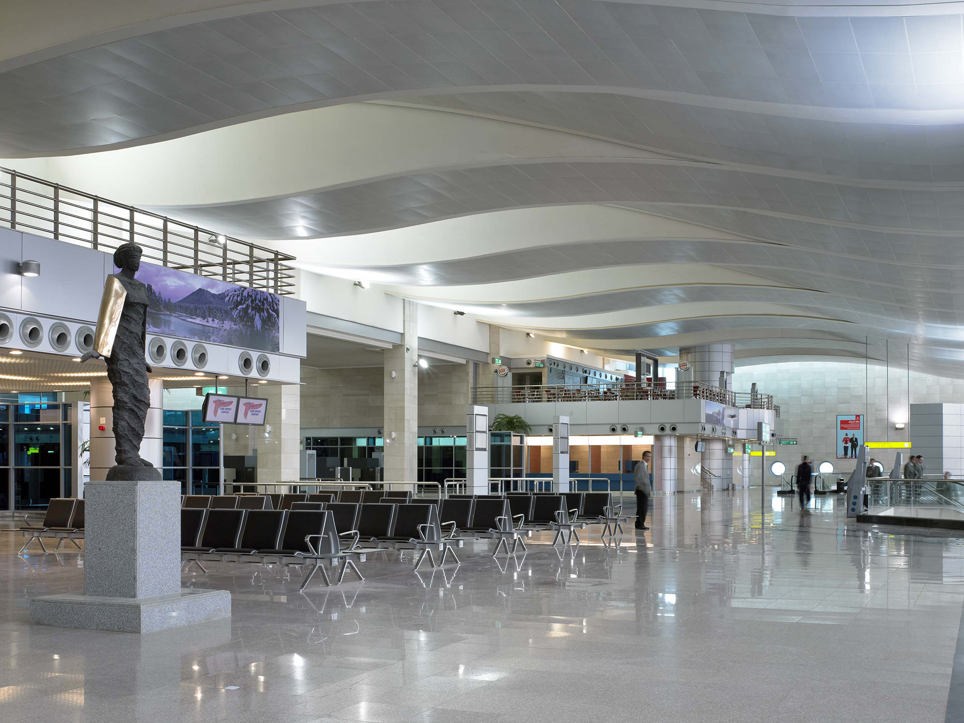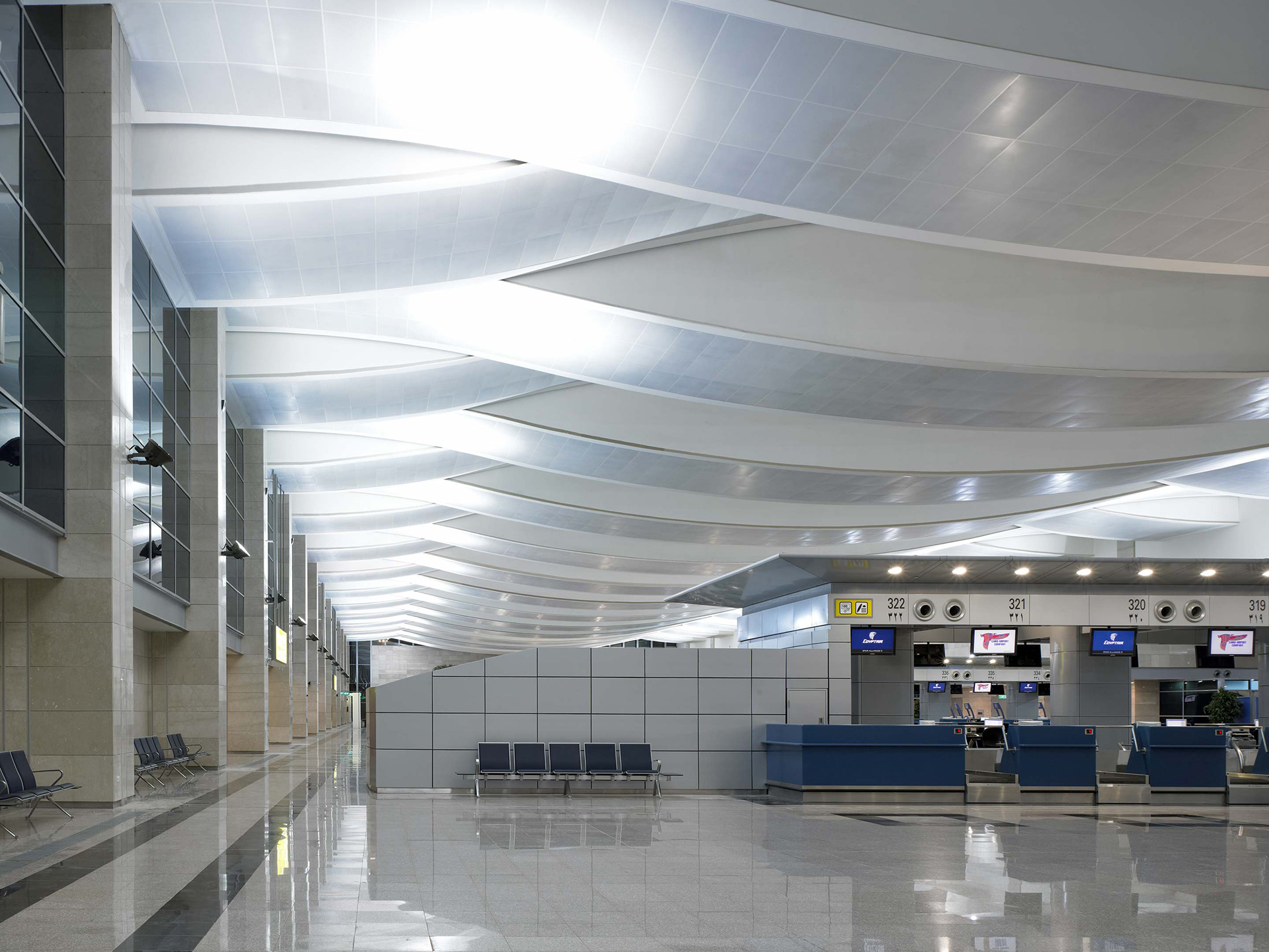 The design inspiration for the Duty Free area was taken from the Khan al-khalili bazaar in Cairo and reflected the local culture. The undulating ceiling spans over the island offices and accommodation to give continuity in terms of wayfinding.