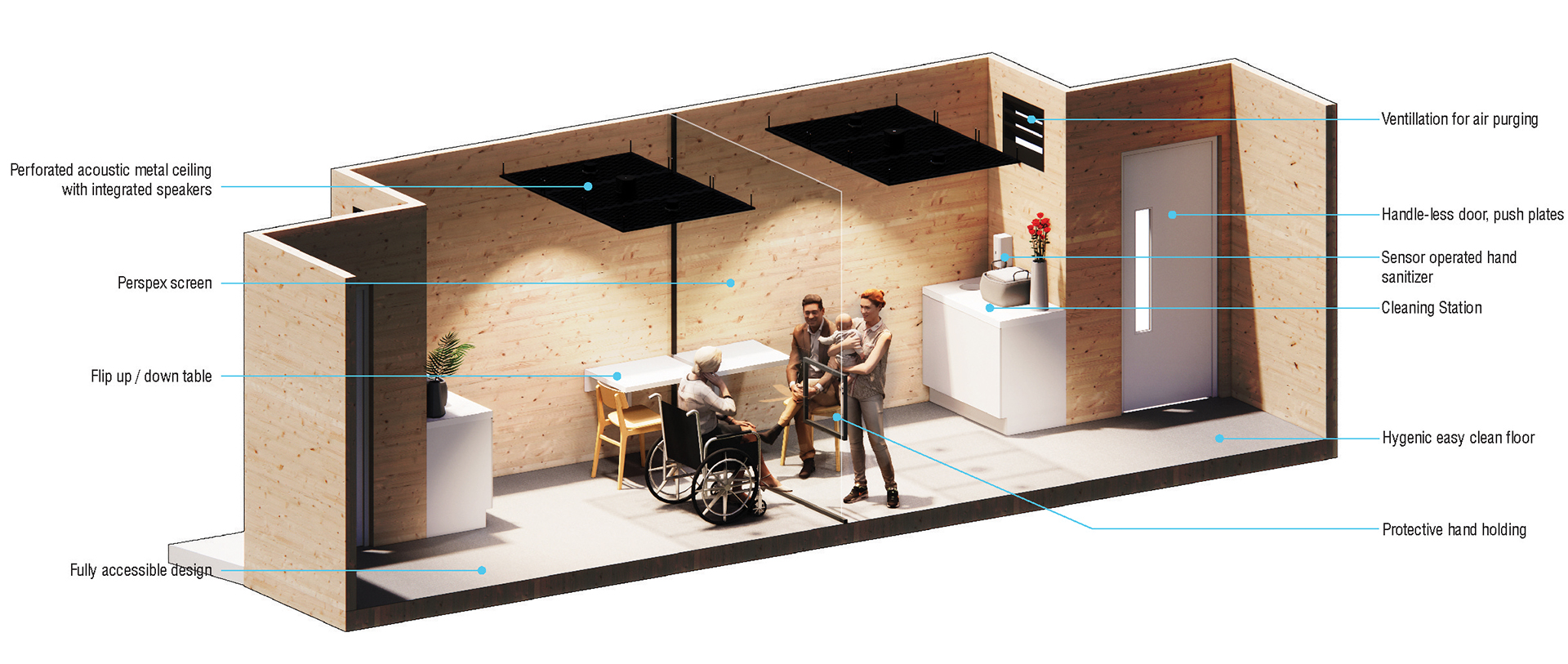 Each side of the partition incorporates a handle-less door, ventilation, a cleaning station with a sensor operated sanitiser and a flip up/down table. A perforated acoustic metal ceiling has integrated speakers to support communication.