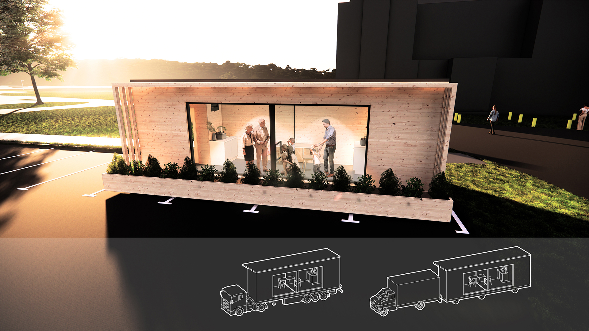 The Social Contact Pod recognises the desperate need for people, particularly the elderly, to maintain a physical connection with loved ones despite the virus. Constructed from simple low cost, Cross Laminated Timber (CLT) panels (potentially surplus stock from house builds), it is lightweight, rapidly constructed and is easily transported on the back of a standard truck or pulled on a trailer. It can be installed at the entrance to a care home, hospital or recovery centre. Or dropped in a carpark or garden for immediate use.