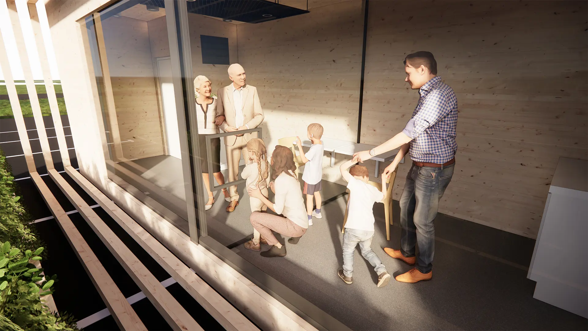 In light of the Covid-19 pandemic, Scott Brownrigg’s Design Research Unit joined together with CLT experts, Ramboll and M&E and sustainability specialists, Hoare Lea to design a solution that allows families to spend valuable time with vulnerable loved ones without the risk of contamination.